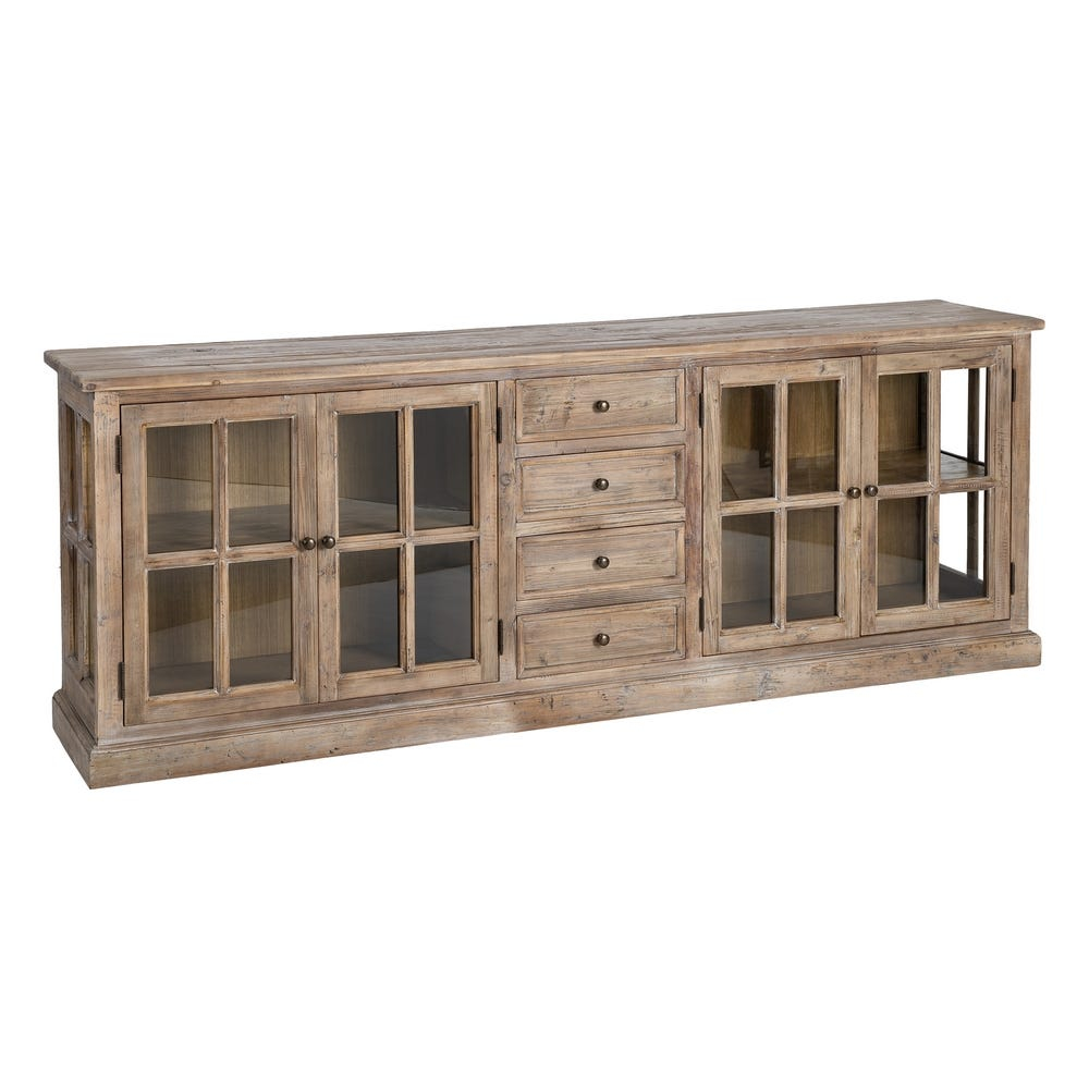 Structura amplă combină vitrinele cu sticlă și sertarele centrale într-un mod coerent și funcțional. Spațiile vitrate adaugă profunzime și transparență, ideale pentru ceramică, porțelan sau obiecte decorative, în timp ce sertarele permit depozitarea discretă a elementelor mai puțin vizibile. Lemnul păstrează variații naturale de culoare și fibră, ceea ce face ca fiecare bufet să fie diferit.