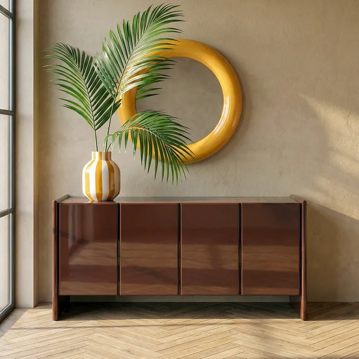 Sfatul Designerului CreativDeco: Asociază acest bufet cu pereți în tonuri neutre și accente metalice calde pentru a evidenția culoarea grena. O lampă decorativă cu lumină caldă sau un obiect minimalist pe blat vor completa perfect atmosfera elegantă a spațiului.