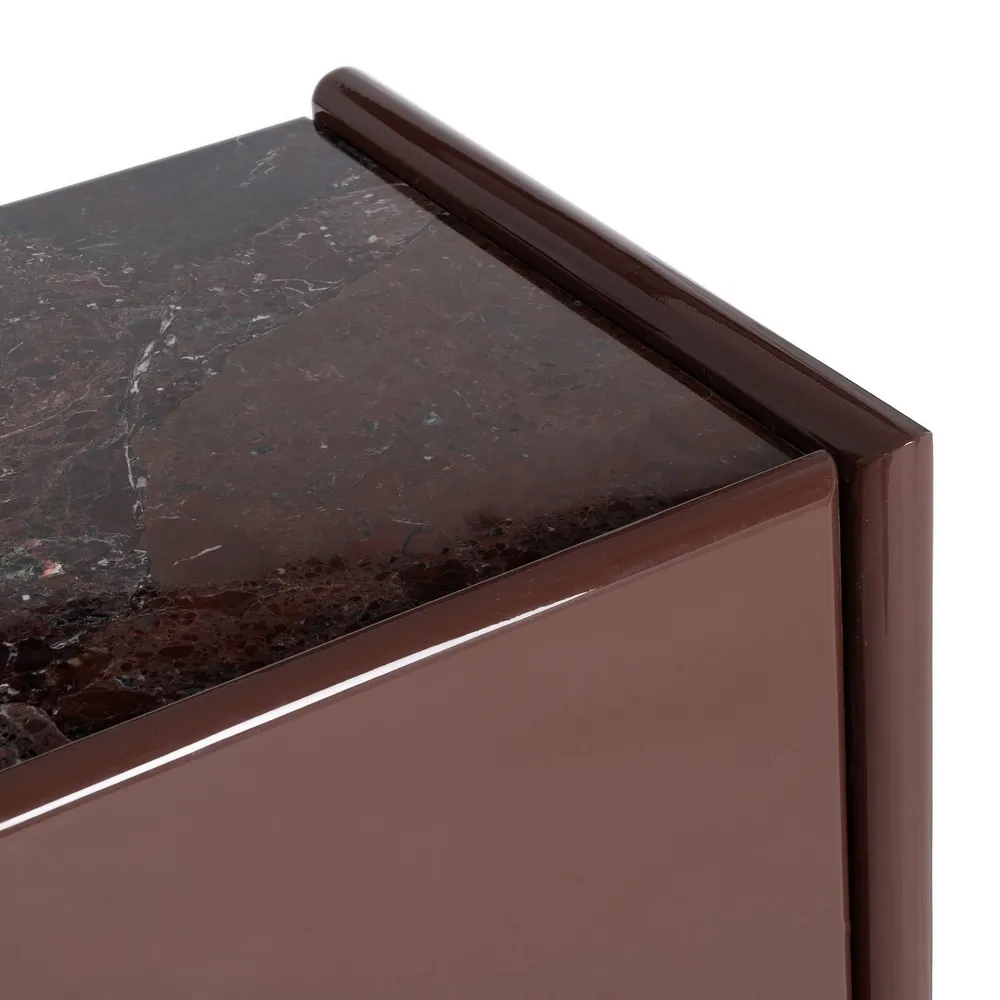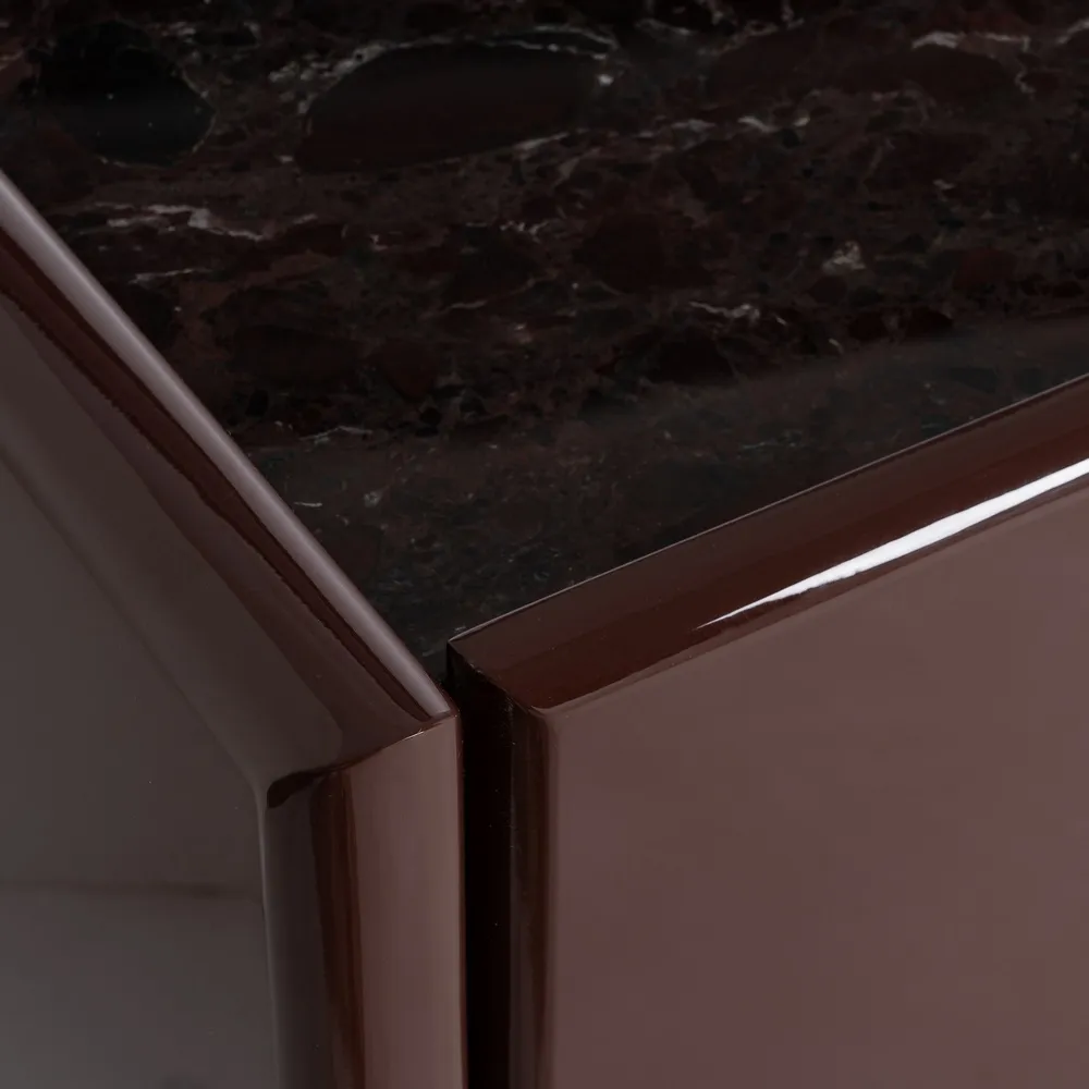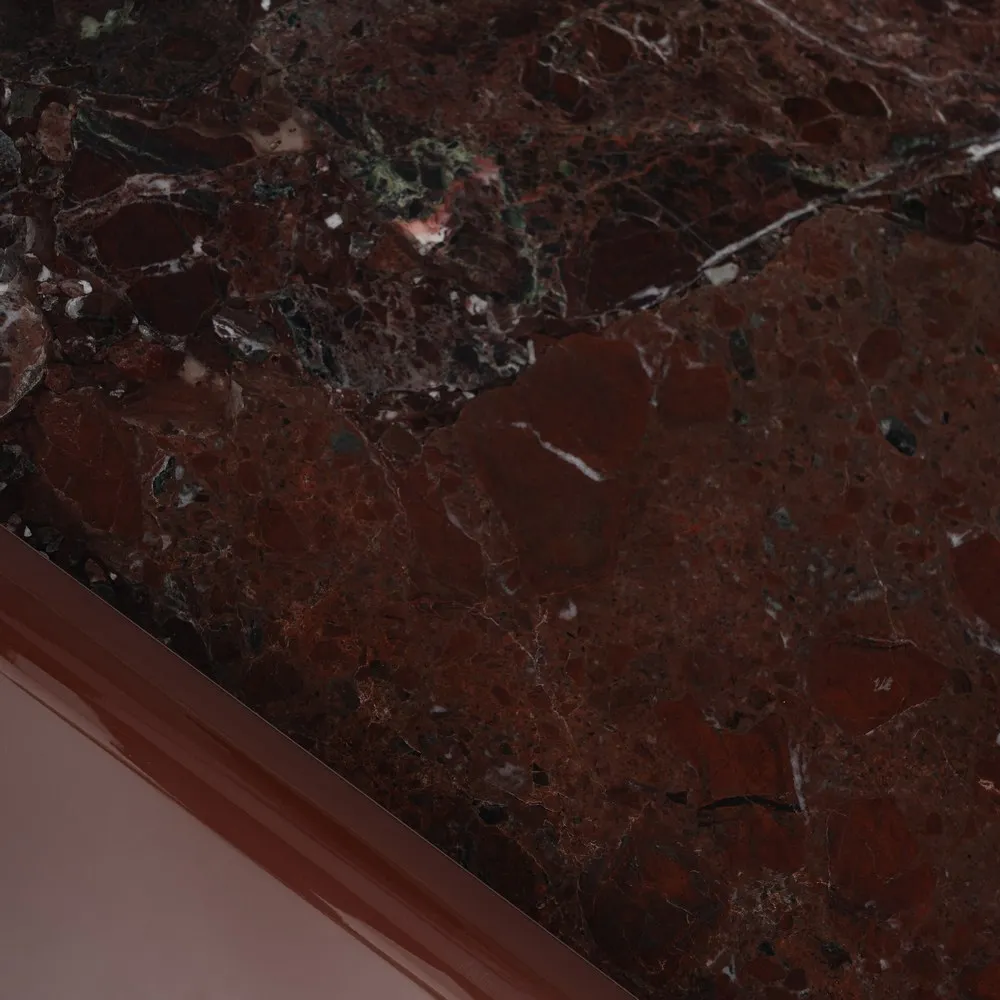 Structura este realizată din MDF lacuit, cu un finisaj uniform și profund, care evidențiază culoarea grena și îi conferă un aspect rafinat și actual. Blatul din marmură adaugă un contrast natural și prețios, fiecare piesă având variații subtile de desen și nuanță, specifice acestui material.