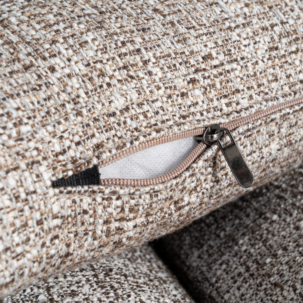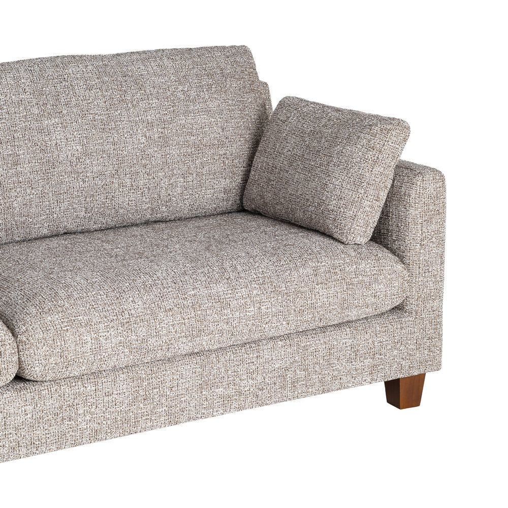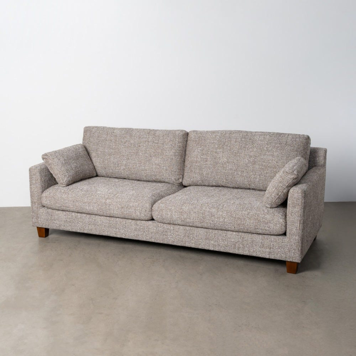 Canapeaua este realizată din stofă grej, cu o textură uniformă și densă, care evidențiază volumele șezutului și ale spătarului. Pernele detașabile pentru șezut, spătar și laterale sunt integrate armonios și contribuie la un aspect ordonat și confortabil.