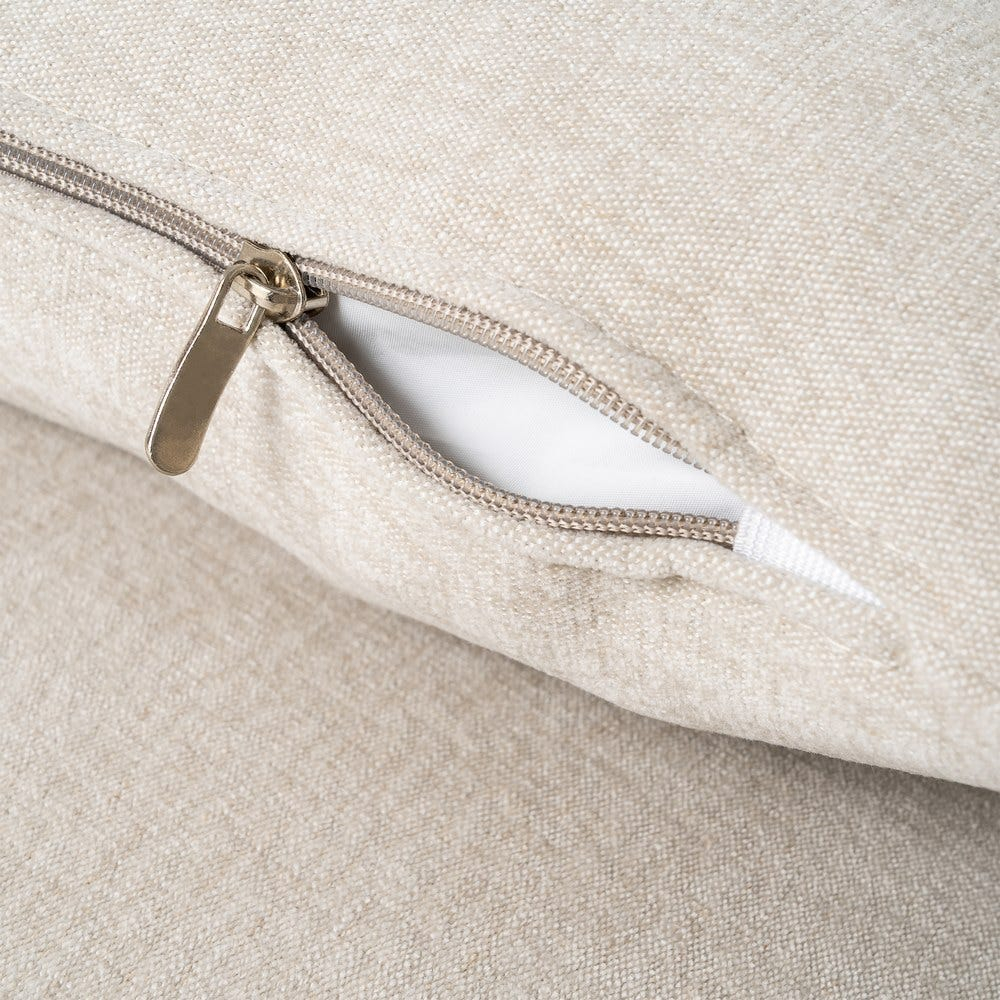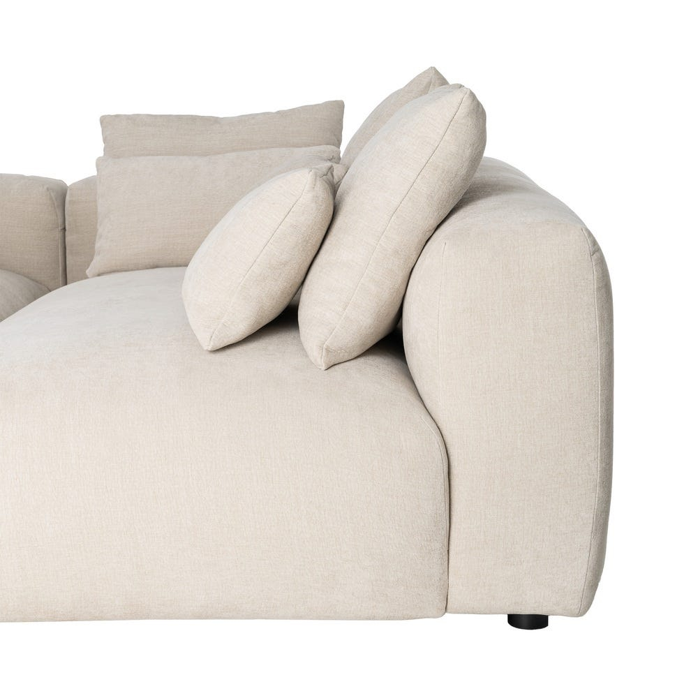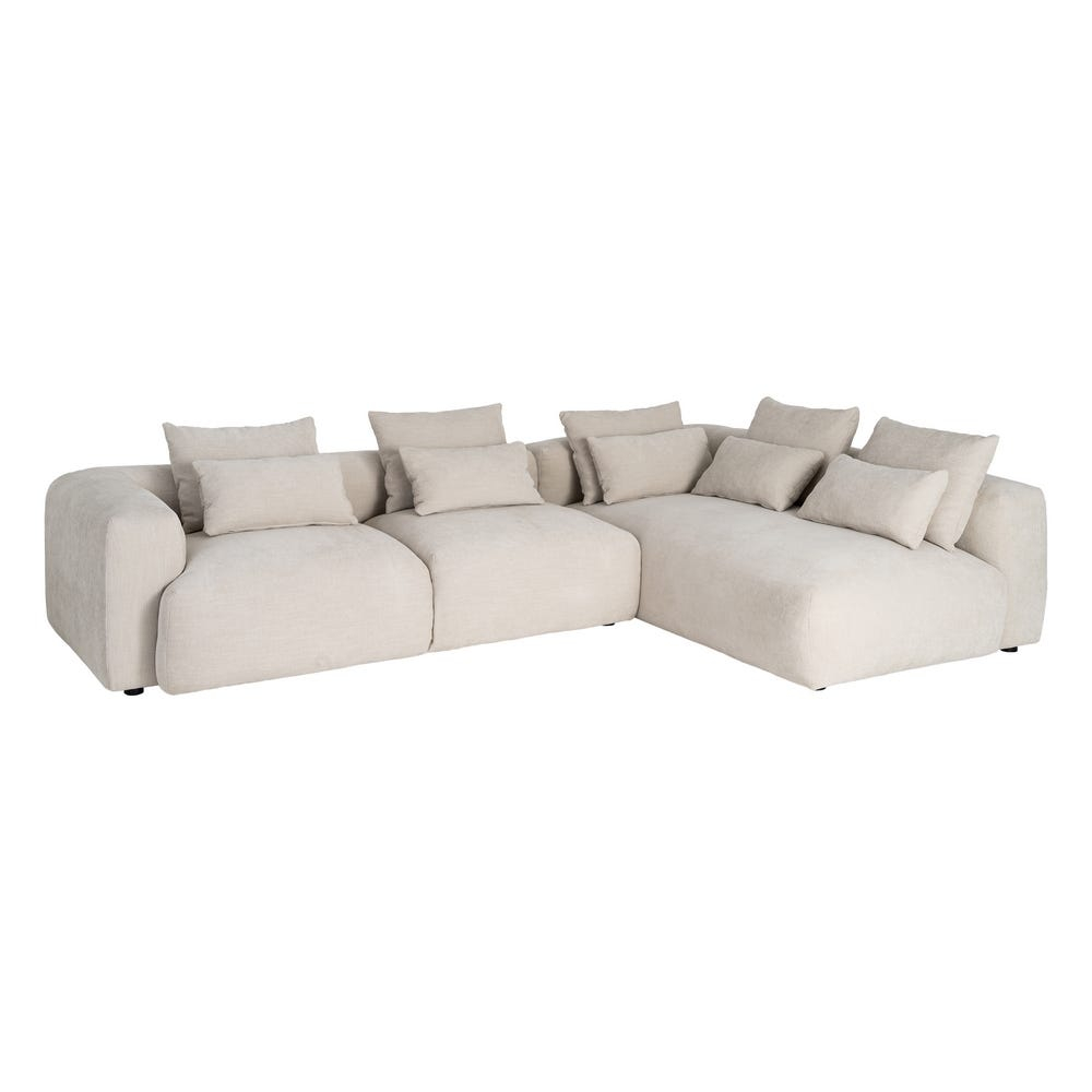 Canapeaua este realizată din stofă bej, cu o textură uniformă și un aspect cald, potrivit pentru spații luminoase. Pernele de spătar și cele decorative sunt bine proporționate și contribuie la imaginea compactă și primitoare a piesei, iar șezlongul poziționat pe partea stângă extinde zona de ședere.
