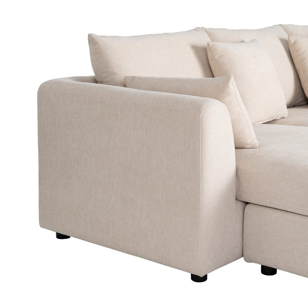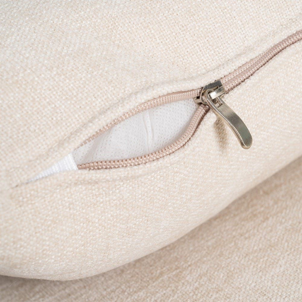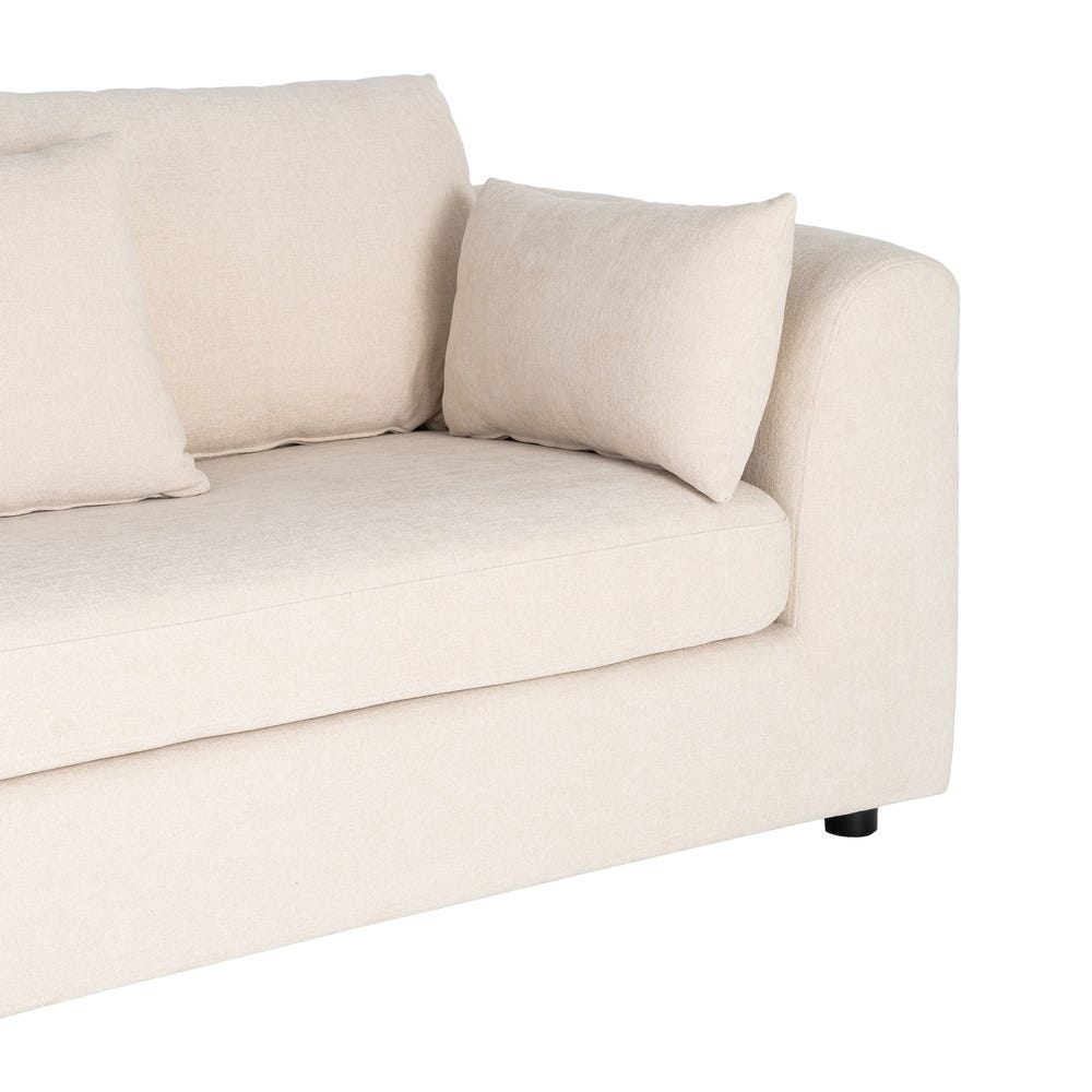 Canapeaua este realizată din stofă crem, cu un aspect luminos și uniform, ușor de integrat în diferite scheme cromatice. Pernele de spătar și cele decorative sunt dispuse echilibrat, contribuind la un confort vizual plăcut și la un profil compact al piesei.