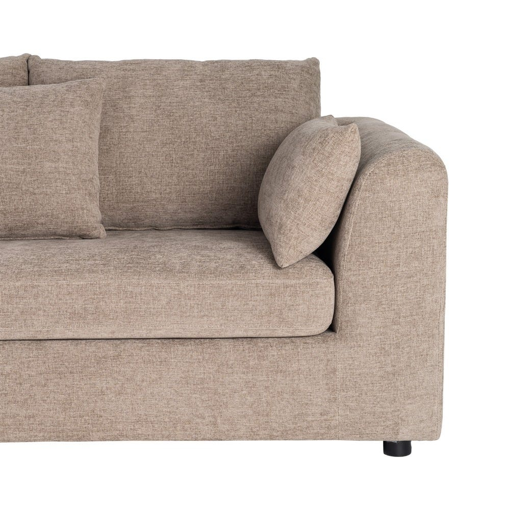 Canapeaua este realizată din stofă maro deschis, cu o textură uniformă care pune în valoare liniile drepte ale șezutului și ale brațelor. Pernele de spătar și cele decorative completează vizual ansamblul și susțin un aspect ordonat și relaxat.