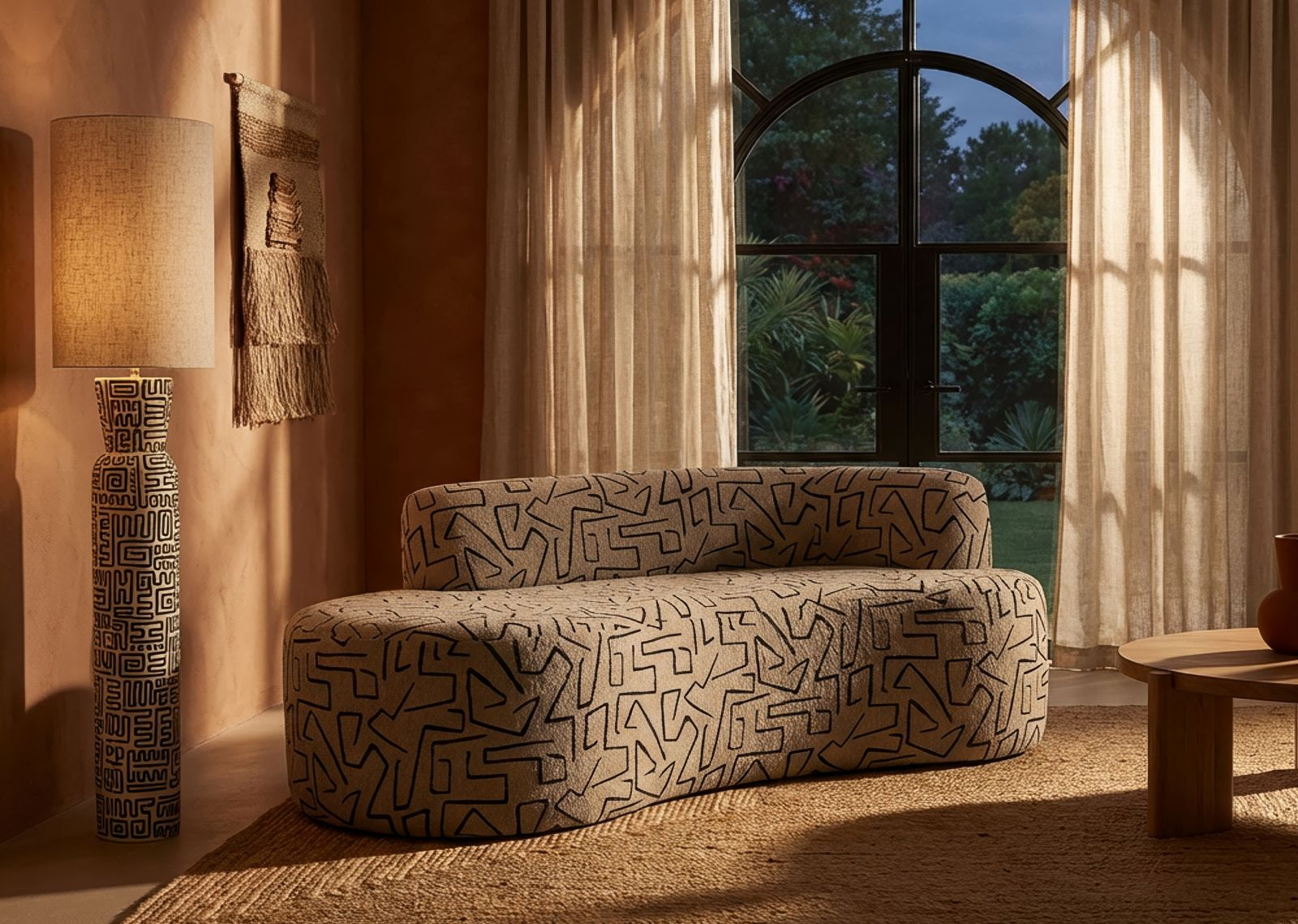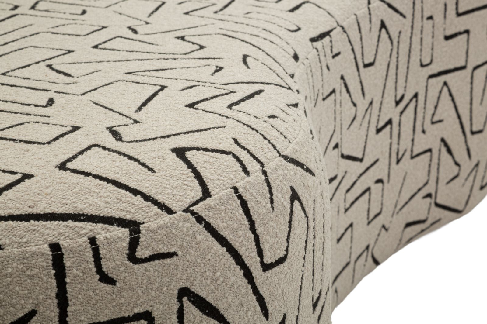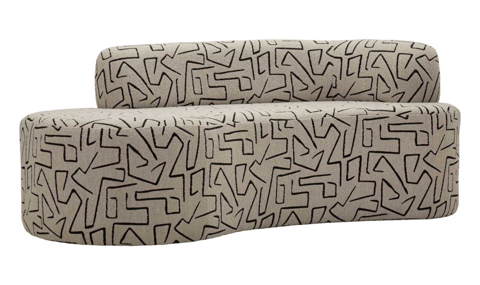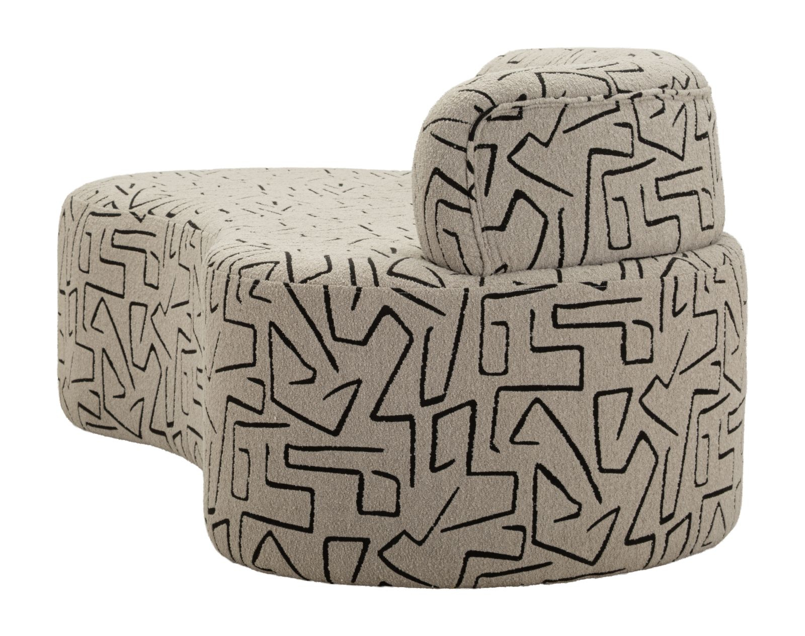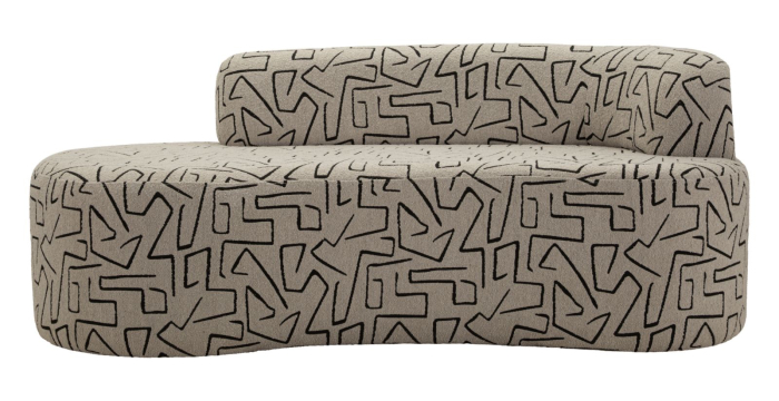 Suprafața tapițată este pusă în valoare de motivele geometrice cu inspirație artistică, care acoperă uniform întreaga structură. Liniile rotunjite ale șezutului și spătarului creează un echilibru între formă și decor, oferind un aspect modern cu influență cosmopolită.