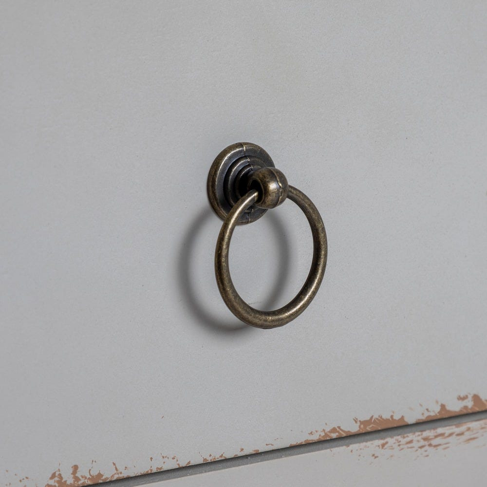 Detaliile atent lucrate, precum mânerele metalice în formă de inel și marginea sculptată discret, dau acestei comode un aer sofisticat și atemporal. Structura robustă și finisajele de calitate o transformă într-o piesă de mobilier practică și elegantă, ideală pentru dormitor, dar potrivită și pentru living sau hol.