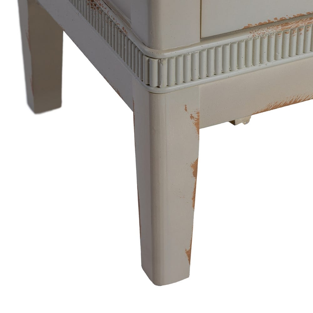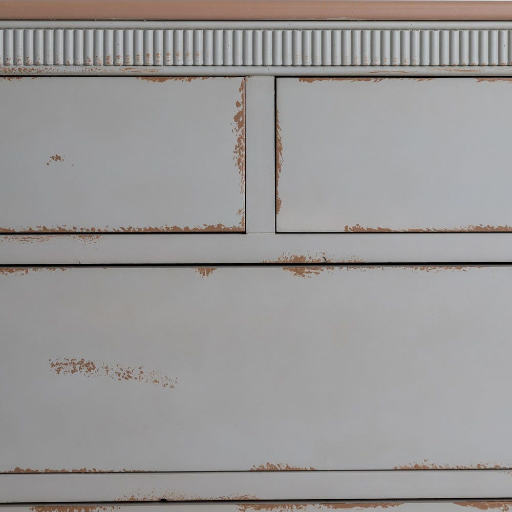Această comodă shabby chic din lemn crem cu blat natur aduce o notă rafinată și caldă dormitorului tău. Designul său clasic, cu detalii atent finisate și linii curate, creează o atmosferă relaxantă și primitoare, fiind perfectă pentru interioare cu influențe provensale, vintage sau country.