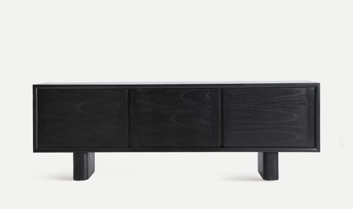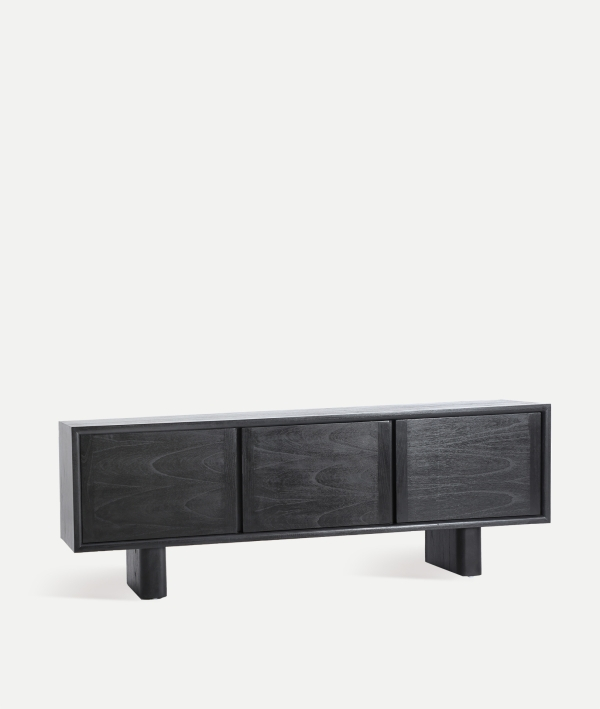 Comodă TV din lemn de mindi negru – o piesă cu prezență puternică și design modern, ce aduce echilibru între funcționalitate și estetică minimalistă. Modelul DEMMIN de la KODU este alegerea ideală pentru interioare contemporane care valorifică simplitatea formelor și naturalețea materialelor.