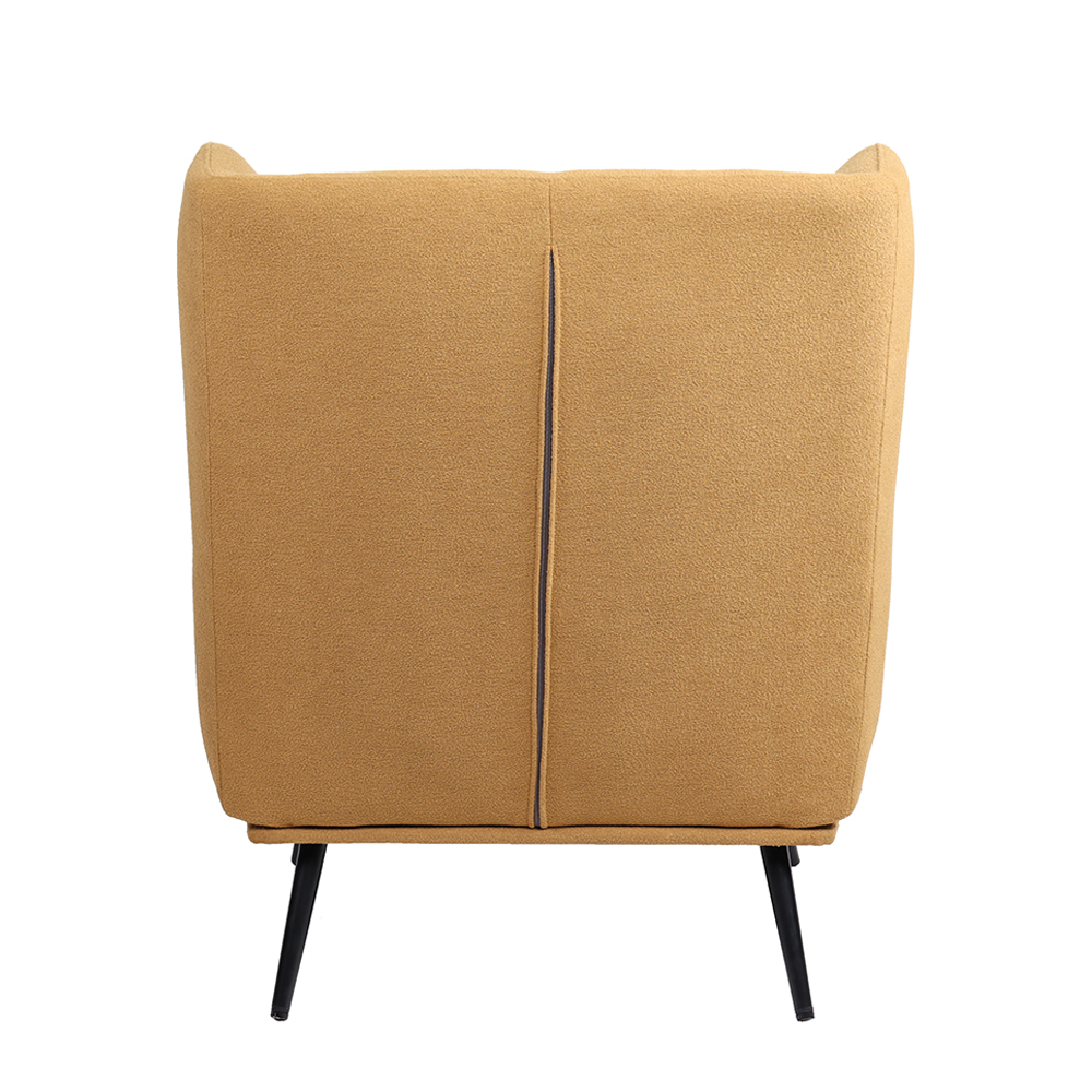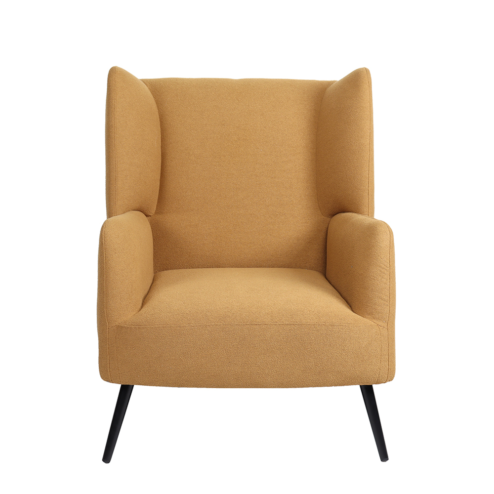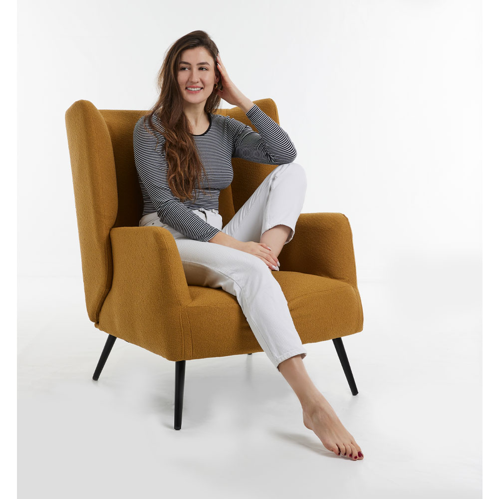 Tapițeria bouclé oferă o textură moale și plină, extrem de plăcută la atingere, dar și un aspect modern, apreciat în amenajările contemporane. Nuanța muștar încălzește vizual încăperea și devine un accent cromatic puternic, fără a încărca spațiul.