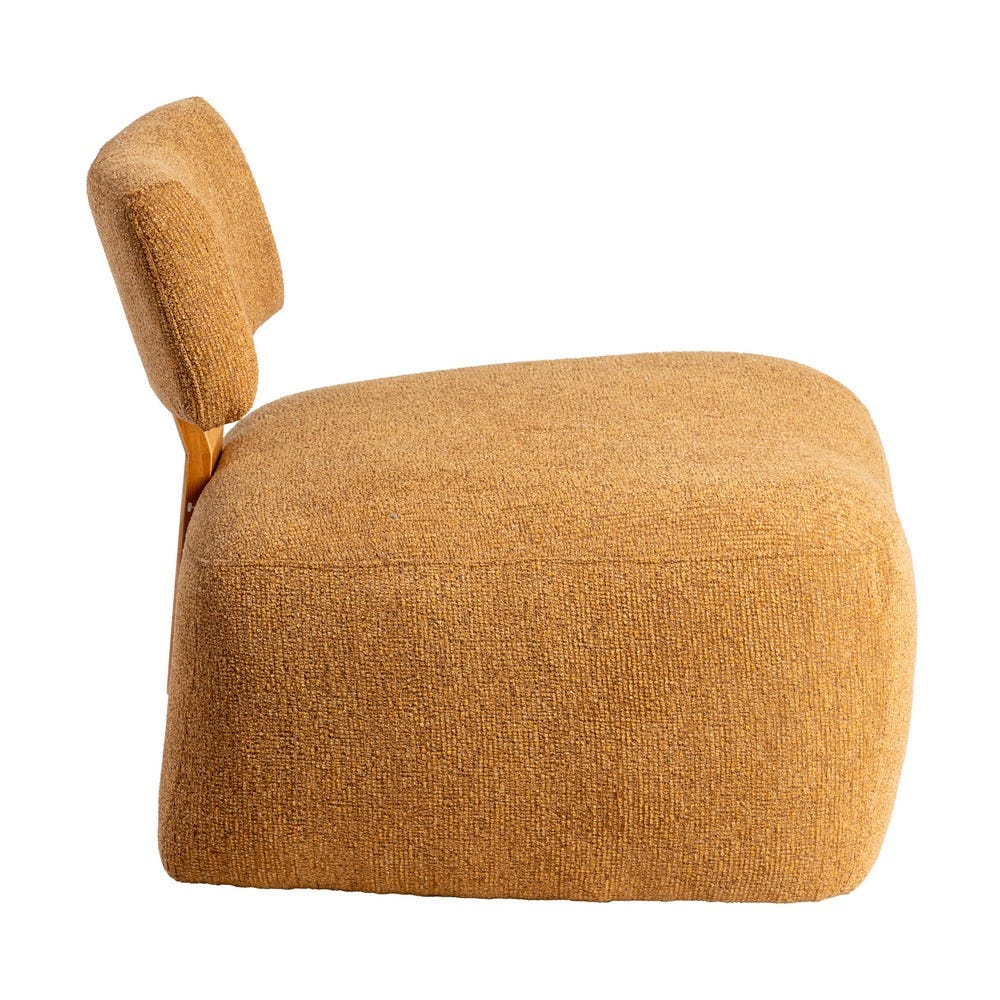 Fotoliul muștar din stofă și lemn cu design minimalist în stil japandi impresionează prin silueta joasă și rotunjită, care creează o atmosferă relaxantă și aerisită. Spătarul mic, bine proporționat, oferă susținere discretă și completează designul echilibrat al piesei.