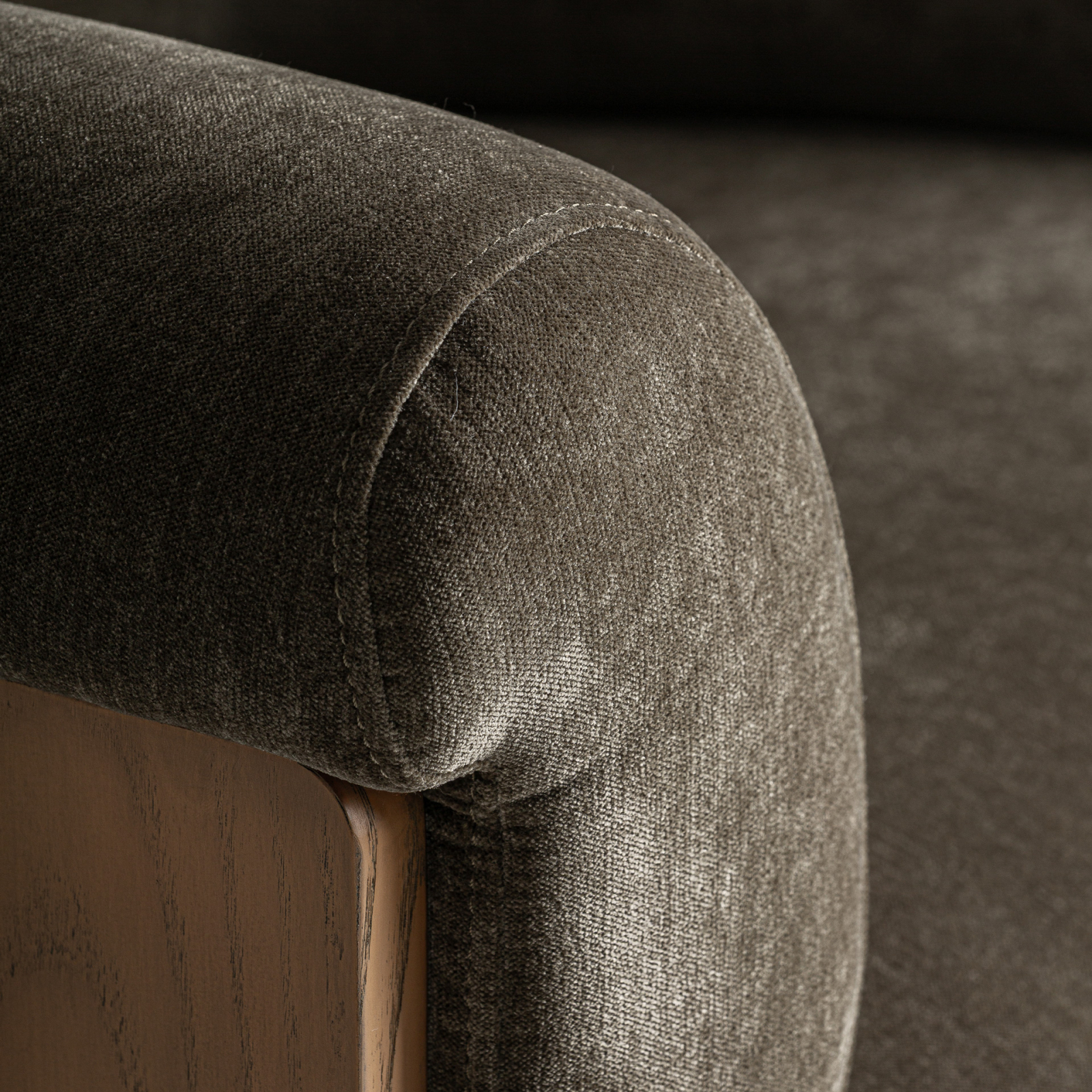 Forma rotunjită a brațelor și volumul compact oferă o senzație de confort și stabilitate, în timp ce textura chenille în nuanță verde adaugă profunzime și personalitate spațiului. Structura vizibilă din lemn de pin în ton maro deschis accentuează caracterul natural al piesei și contribuie la imaginea unui interior atent compus.