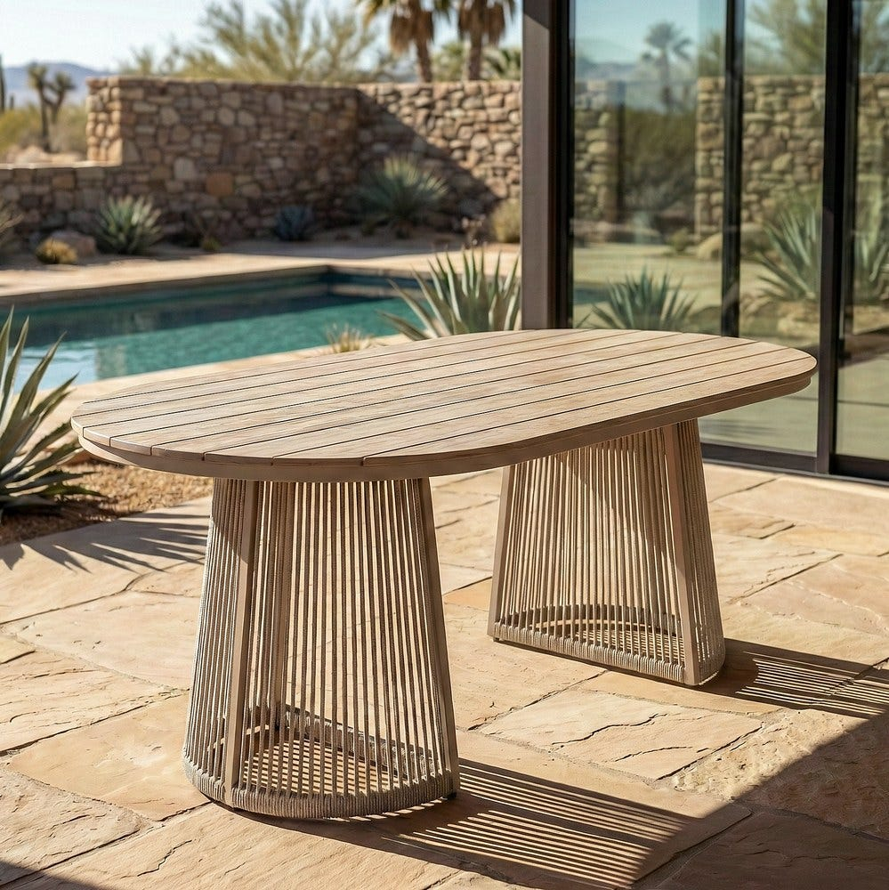 Această masă de dining pentru exterior și HoReCa este concepută pentru terase moderne, restaurante elegante și zone de luat masa în aer liber unde designul și rezistența trebuie să funcționeze împreună. Blatul oval în nuanță naturală este susținut de două baze conice din ratan sintetic bej, integrate pe o structură solidă din oțel.