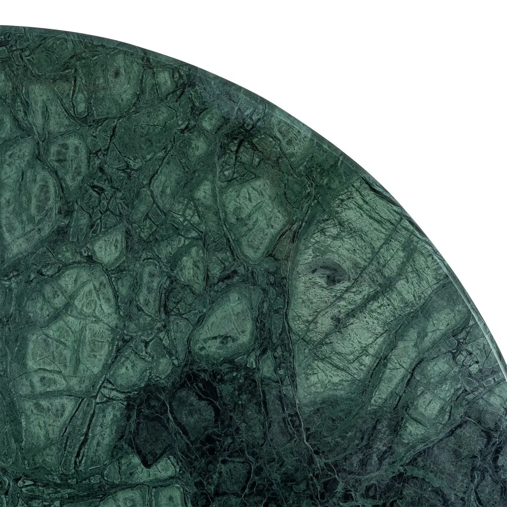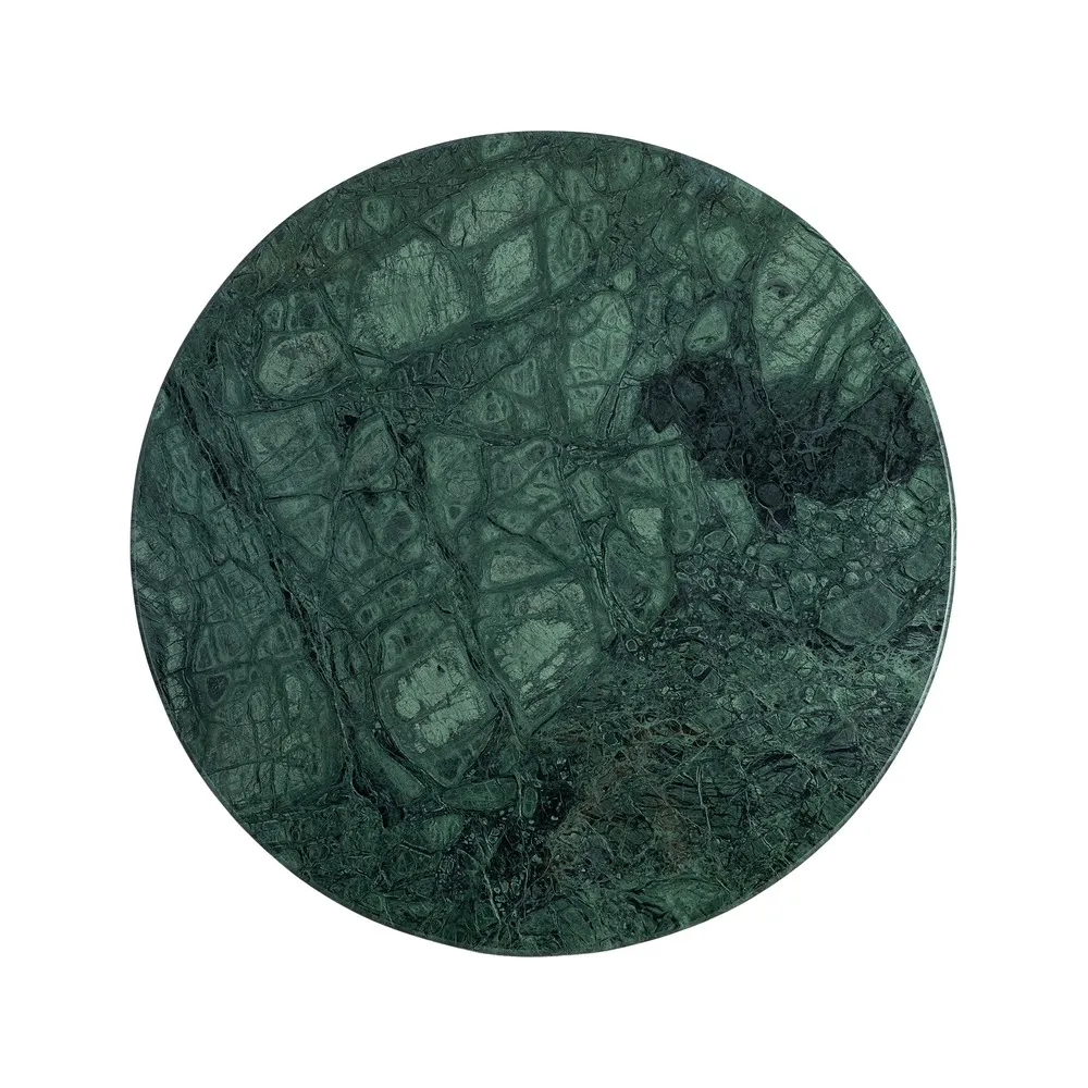 Blatul rotund din marmură verde impresionează prin venatura sa unică, aducând un accent sofisticat și o notă de luminozitate naturală. Baza cilindrică, realizată din lemn masiv de mango, conferă stabilitate și un caracter sculptural aparte, completând perfect estetica rafinată a piesei.