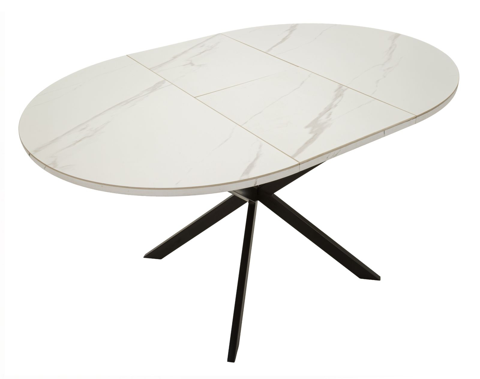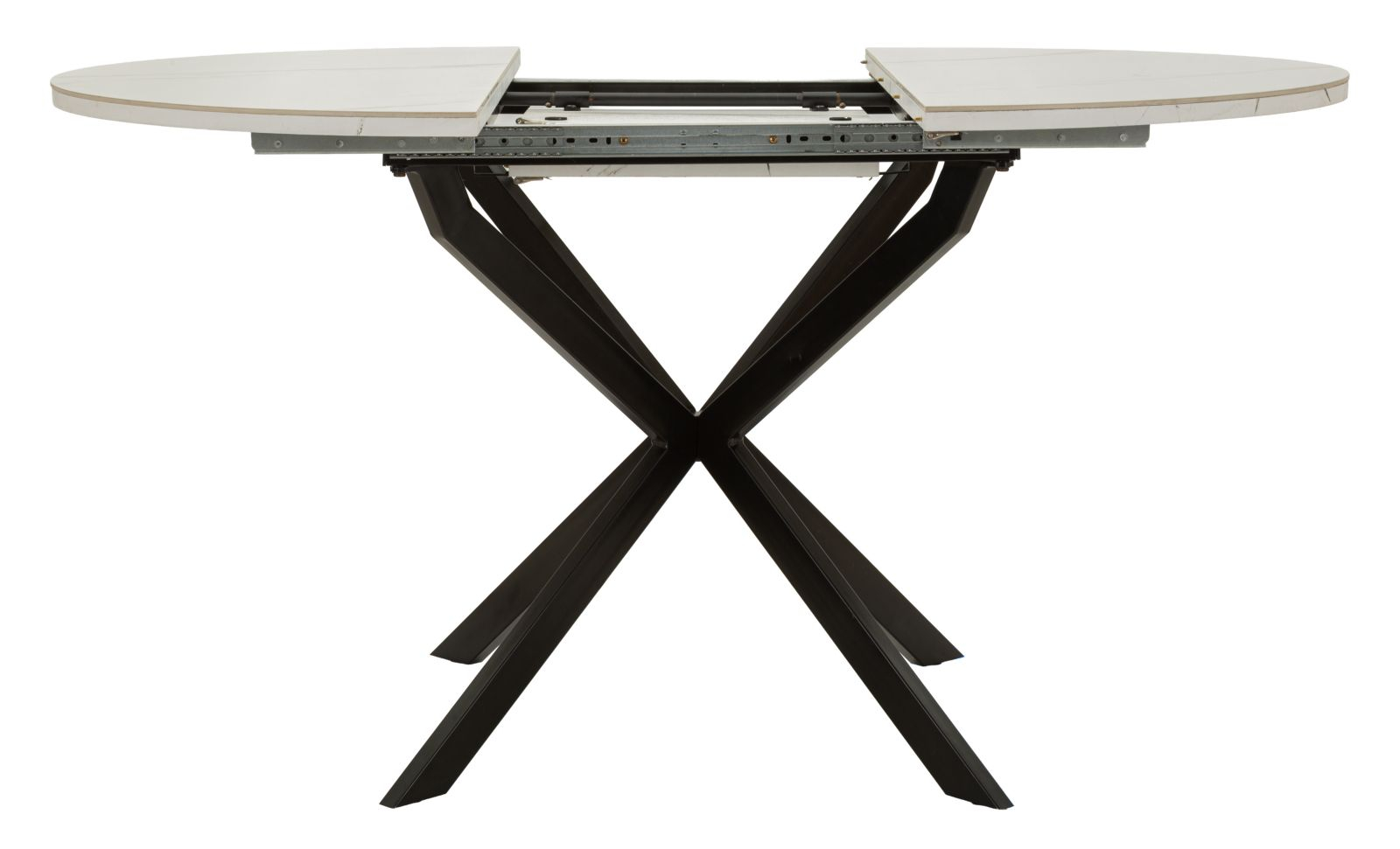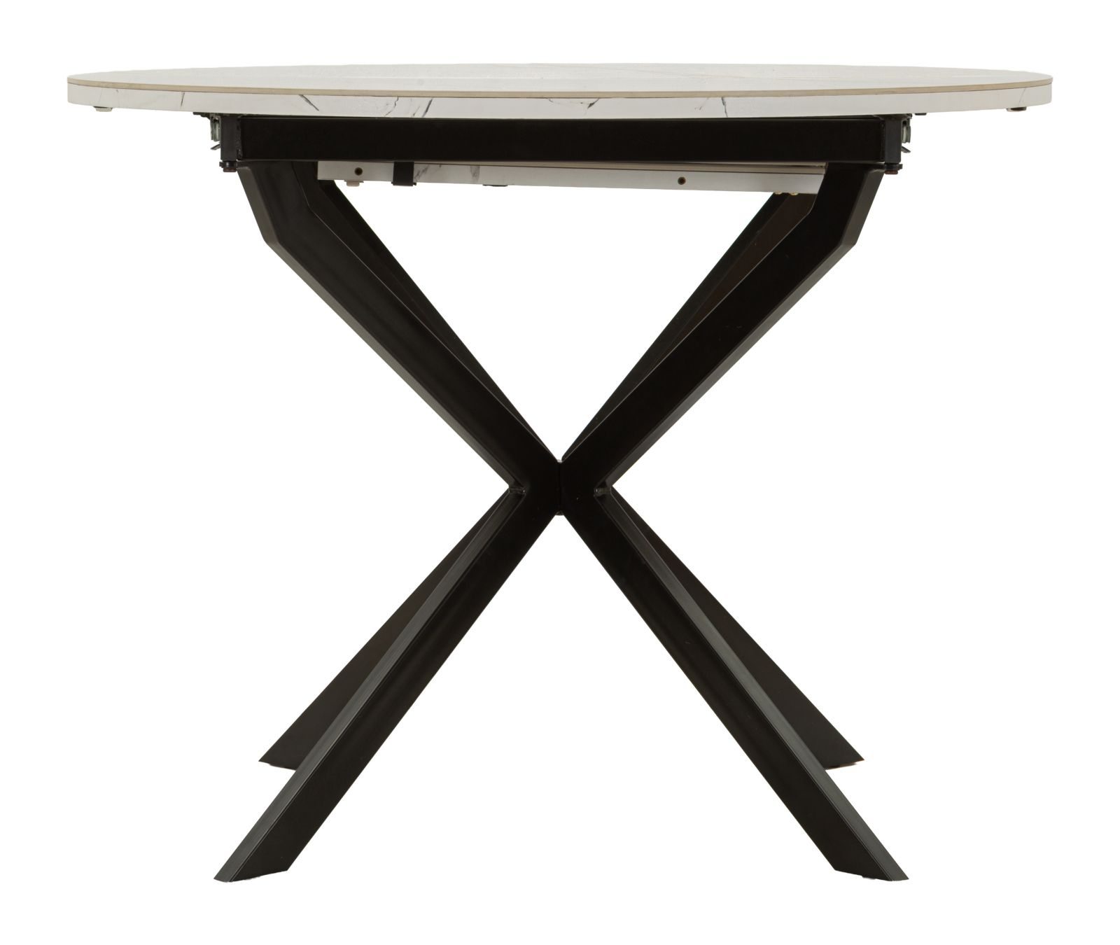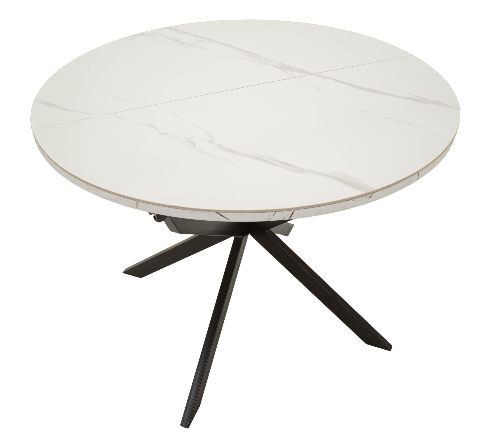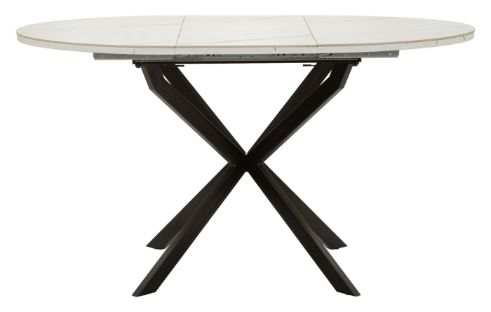 Masă de dining extensibilă rotundă cu blat ceramic efect marmură albă și bază metalică neagră în formă X 100 x 78 cm