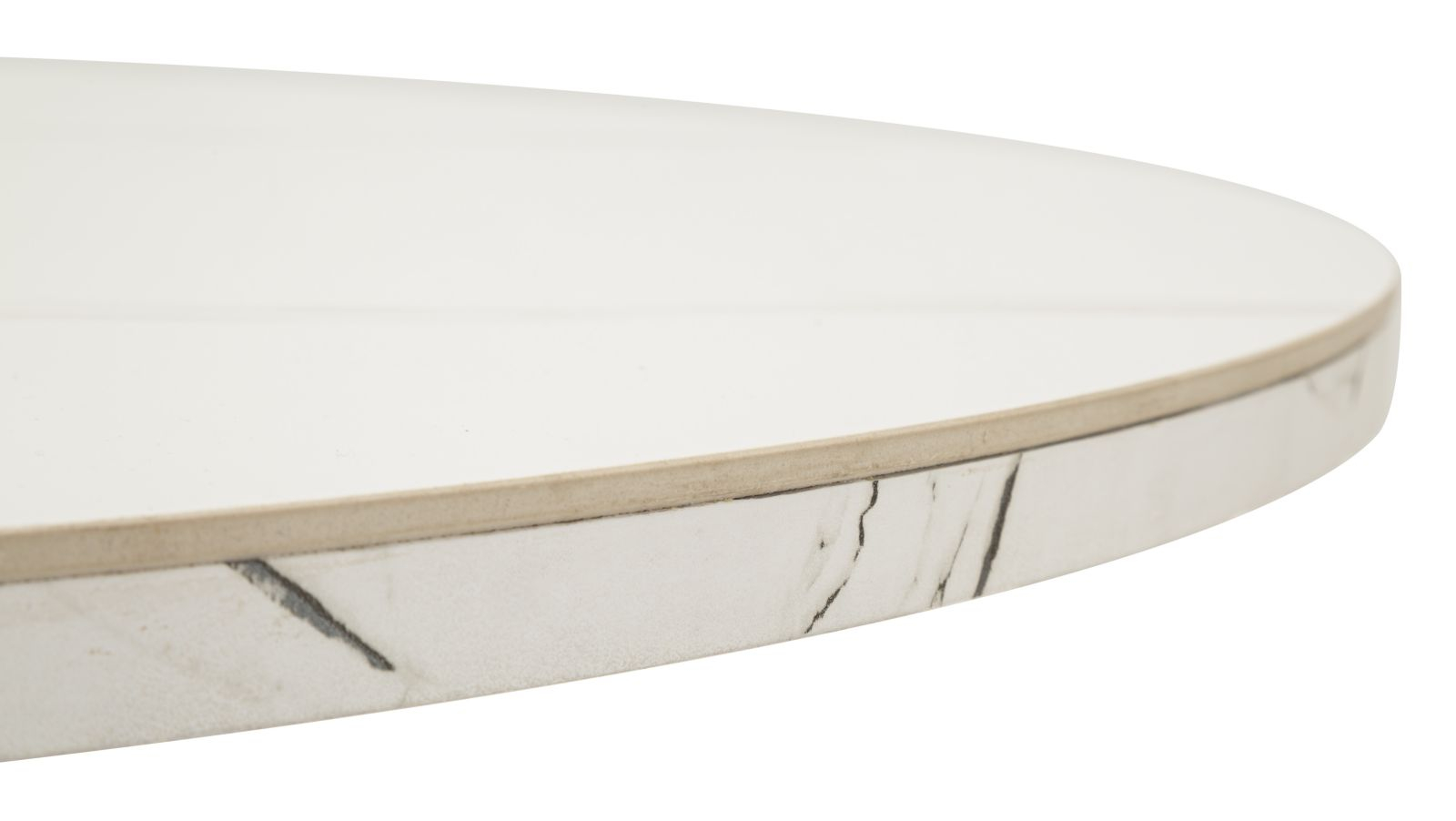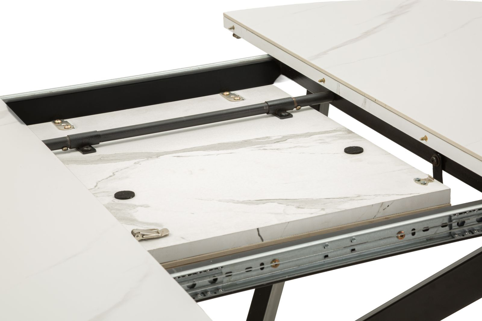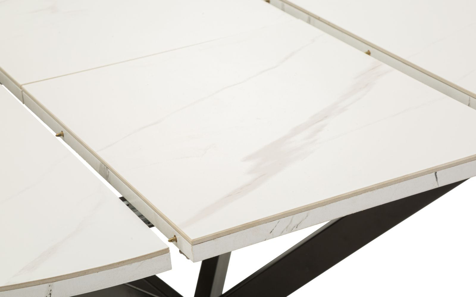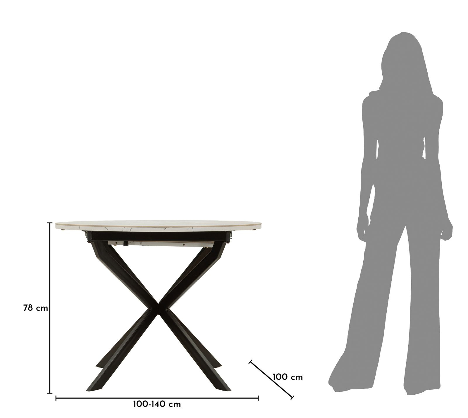 Masă de dining extensibilă rotundă cu blat ceramic efect marmură albă și bază metalică neagră în formă X 100 x 78 cm