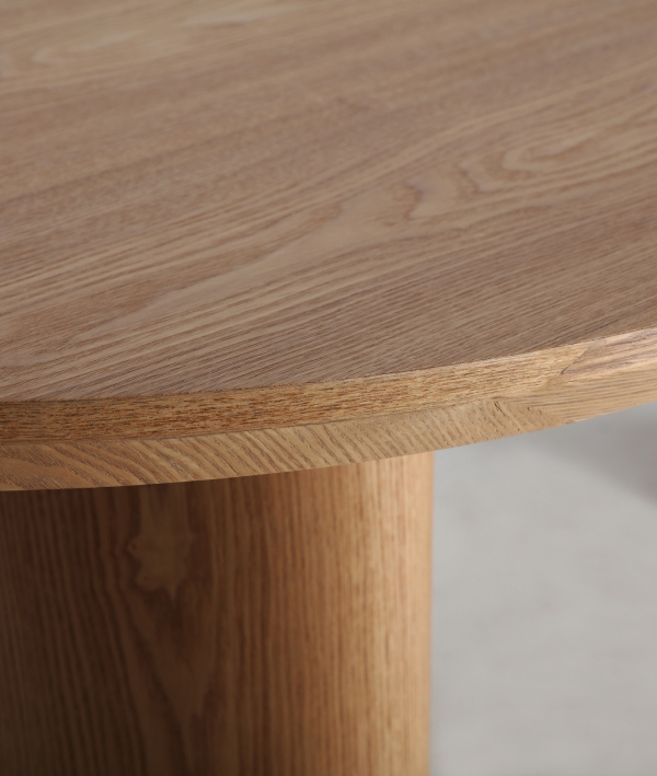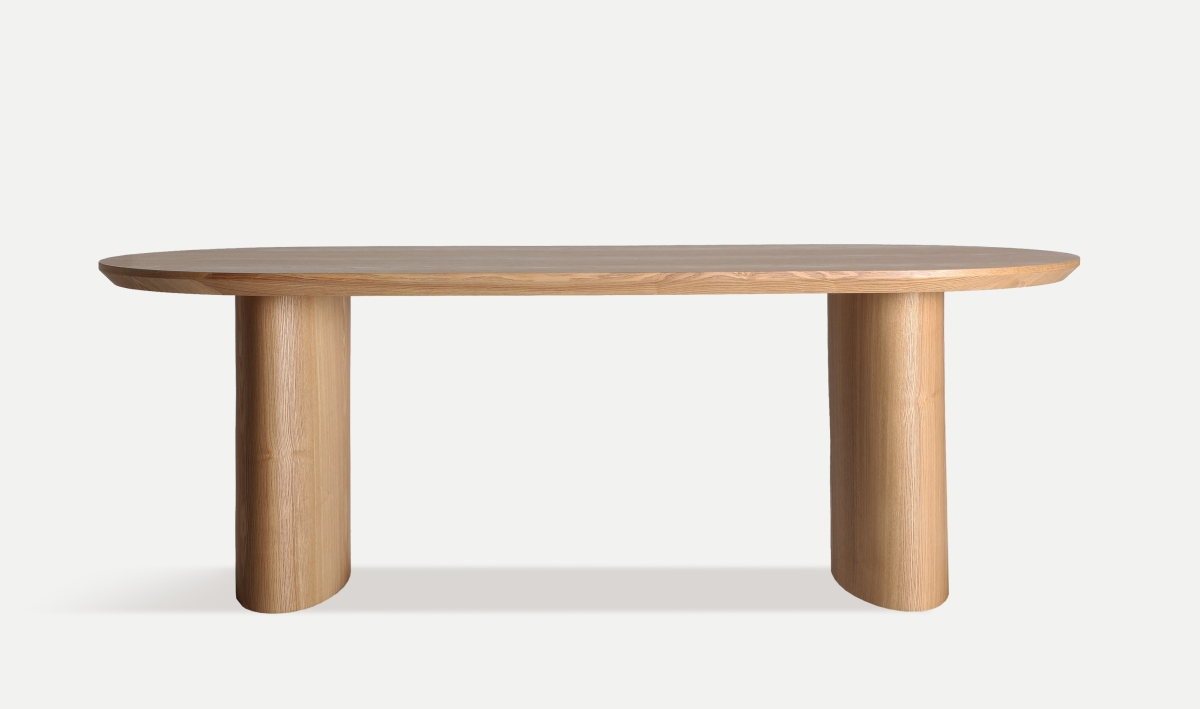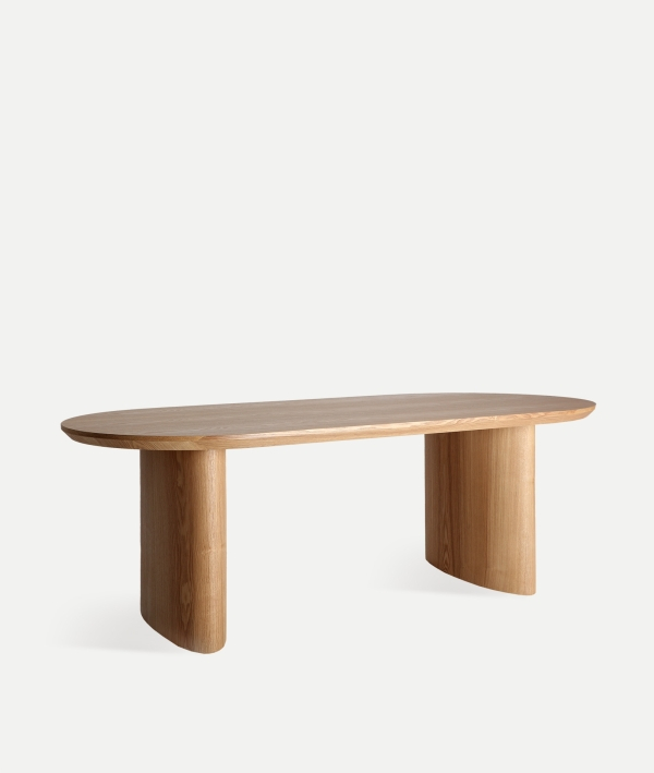 SOMA impresionează prin designul său echilibrat și proporțiile perfecte. Blatul oval din furnir de nuc oferă o senzație de fluiditate și eleganță, în timp ce baza robustă, formată din două picioare cilindrice, creează un efect sculptural distinctiv. Finisajul maro cald pune în valoare fibra naturală a lemnului și se integrează armonios în decoruri moderne și rafinate.