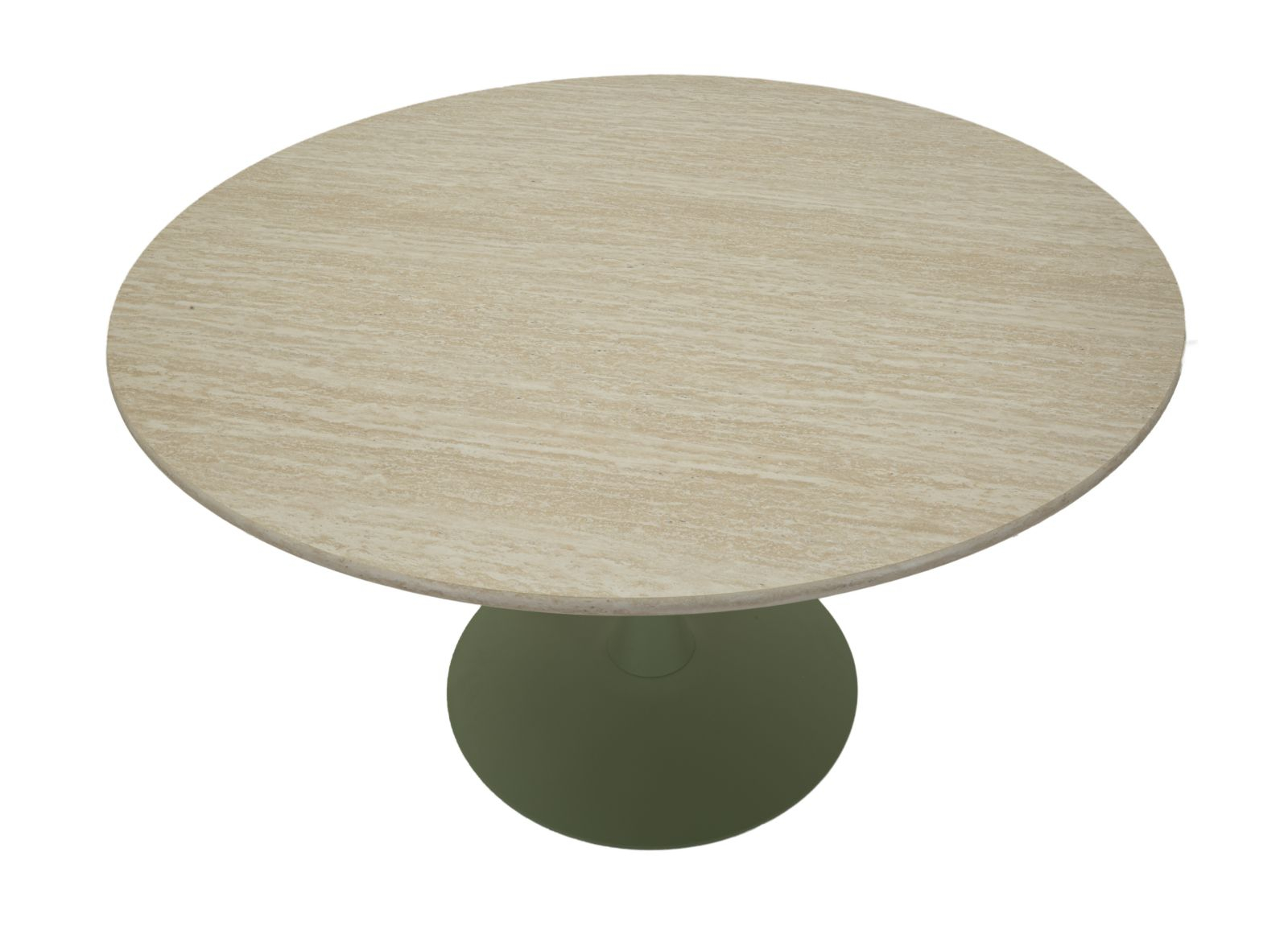 Masă de dining rotundă verde cu picior central metalic STOCCOLMA cu linie fluidă și aspect curat, gândită pentru interioare contemporane unde forma simplă și proporțiile echilibrate contează.
