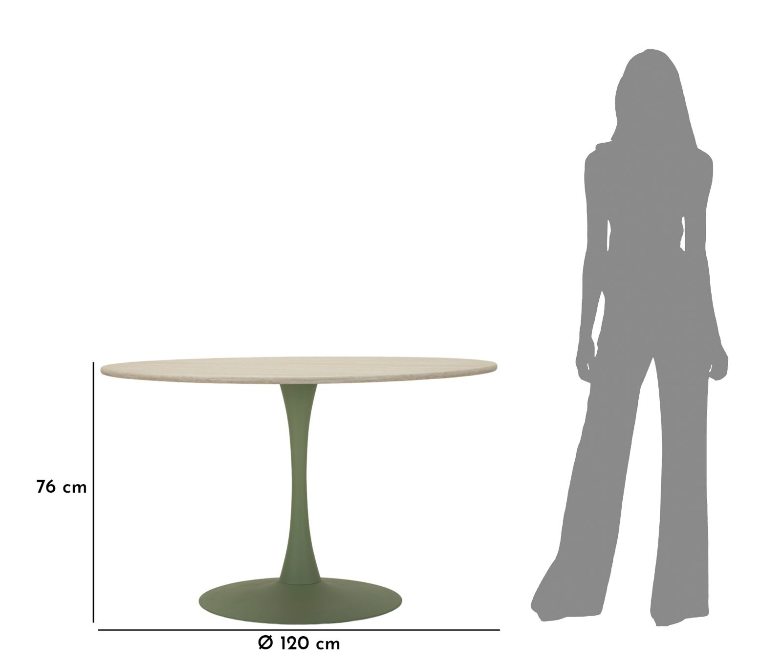 Baza centrală tip tulip, finisată într-un verde plăcut, eliberează spațiul pentru picioare și oferă stabilitate prin talpa circulară. Blatul rotund, subțire vizual, în ton deschis, păstrează masa aerisită și ușor de integrat lângă scaune tapițate sau metalice.