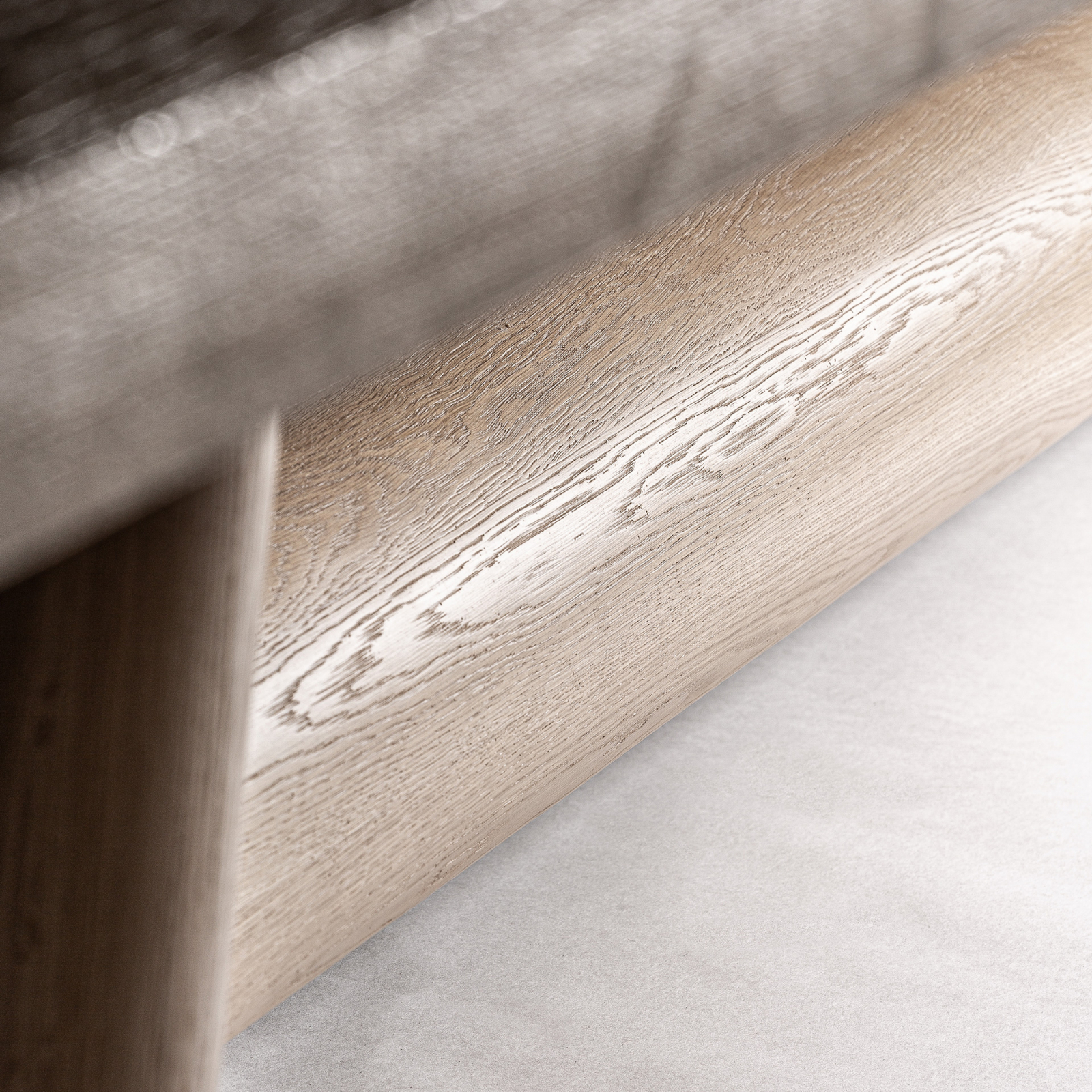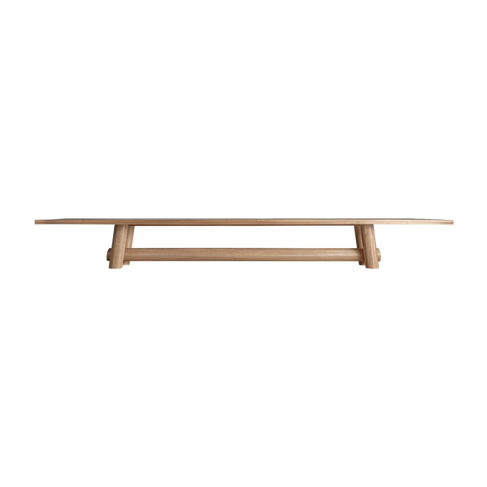 Structura sa este compusă dintr-un blat lat, bine proporționat, și o bază formată din patru picioare înclinate susținute de o bară orizontală, ce evocă simplitatea inginerească a băncilor tradiționale, dar cu o estetică rafinată și contemporană. Textura lemnului este naturală, vizibilă, cu noduri și nervuri autentice, lăsate intenționat neuniforme pentru a sublinia caracterul artizanal al piesei.