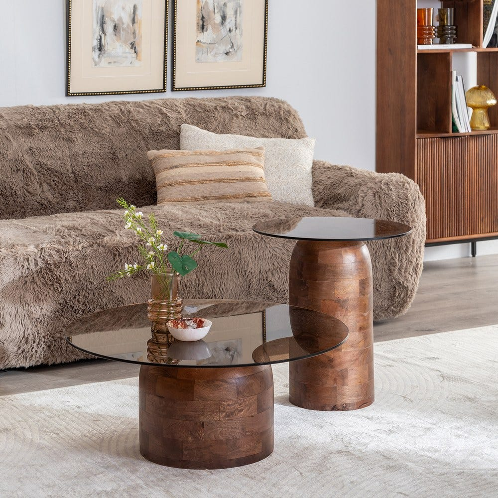 Inspirată de naturalețea liniilor rotunde și contrastul subtil dintre materiale, această masă de cafea aduce o notă caldă și sofisticată în orice spațiu. Realizată din lemn masiv de mango cu finisaj honey, piesa se remarcă prin textura sa naturală și durabilitate, fiind completată elegant de un blat rotund din sticlă securizată.