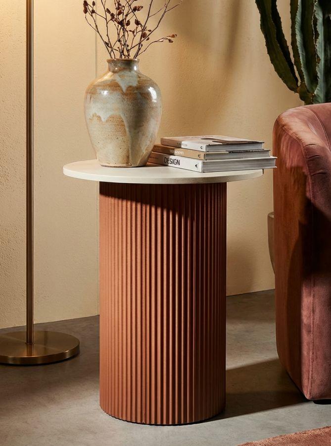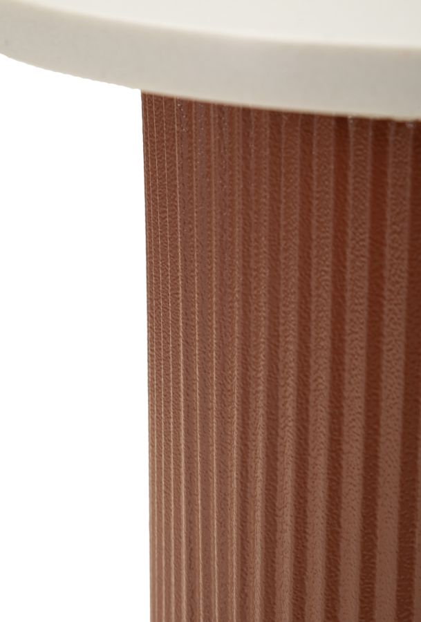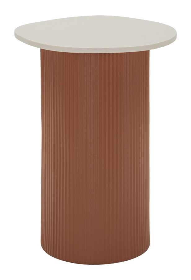 Blatul rotund cu finisaj alb creează un contrast plăcut cu baza cilindrică roșie, evidențiată de textura verticală discretă. Proporțiile suple și forma compactă permit integrarea ușoară lângă o canapea sau un fotoliu, oferind un suport practic pentru obiecte decorative sau accesorii.