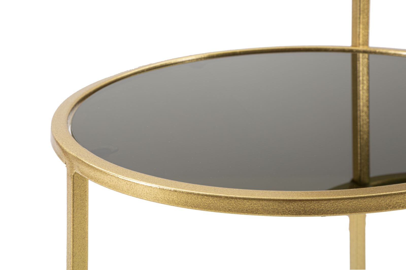 Măsuță laterală rotundă, 2 nivele, stil glamour. Cadru metal auriu, blat sticlă. Adaugă eleganță și funcționalitate oricărui spațiu.