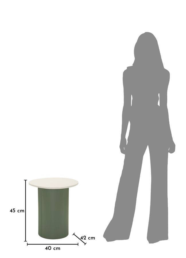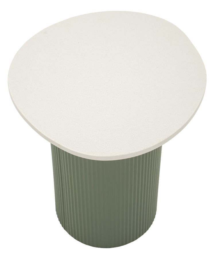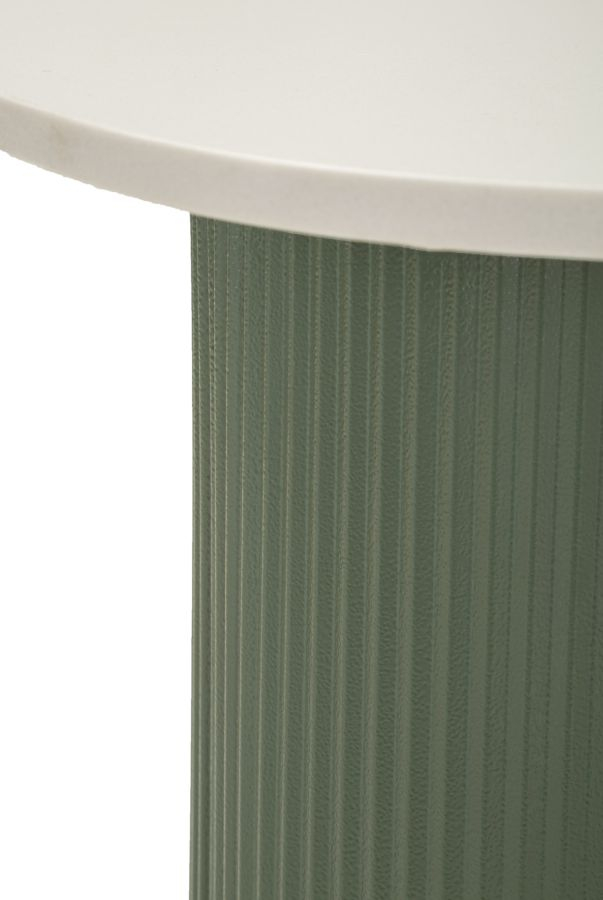Blatul cu finisaj alb are o formă rotunjită, care contrastează subtil cu baza cilindrică verde evidențiată de canelurile verticale. Proporțiile compacte și structura stabilă o fac potrivită lângă o canapea, un fotoliu sau într un colț de relaxare unde este nevoie de un suport discret și funcțional.
