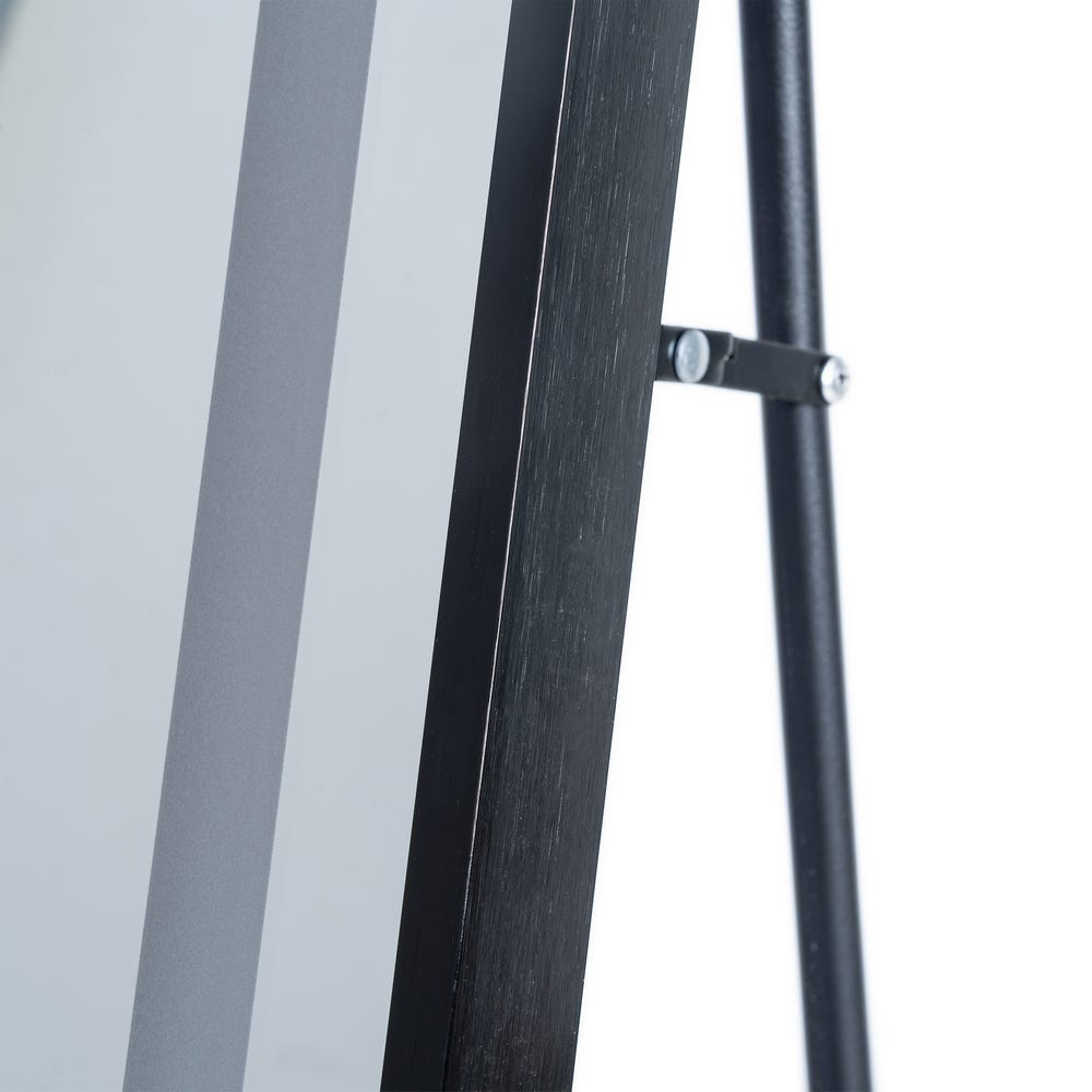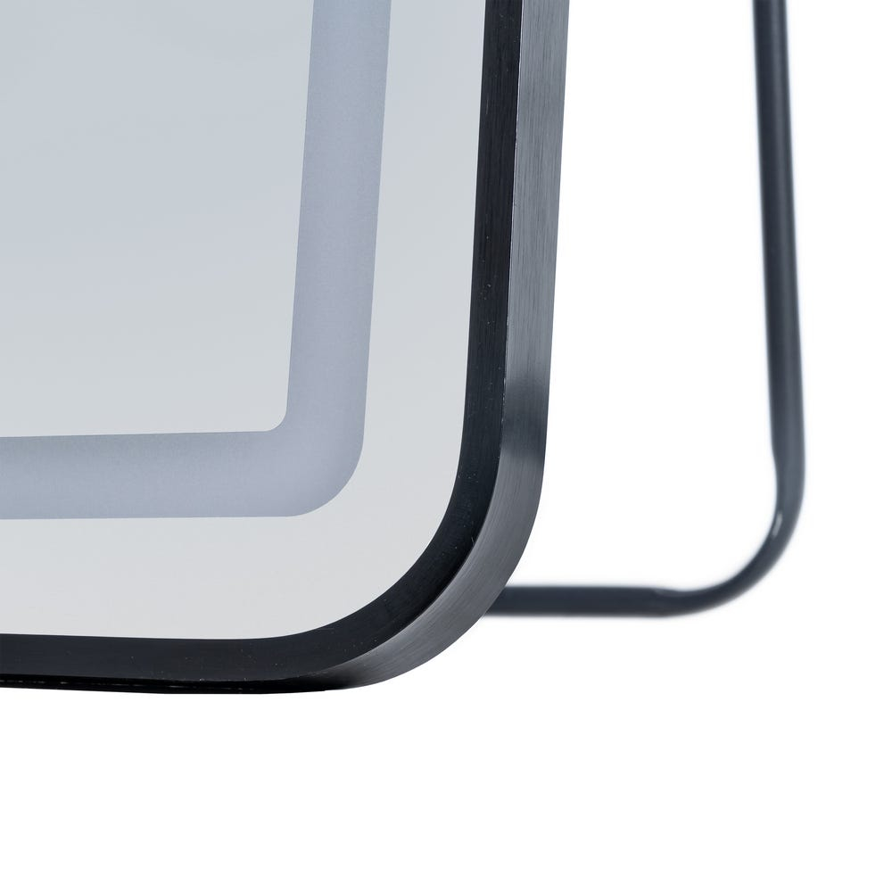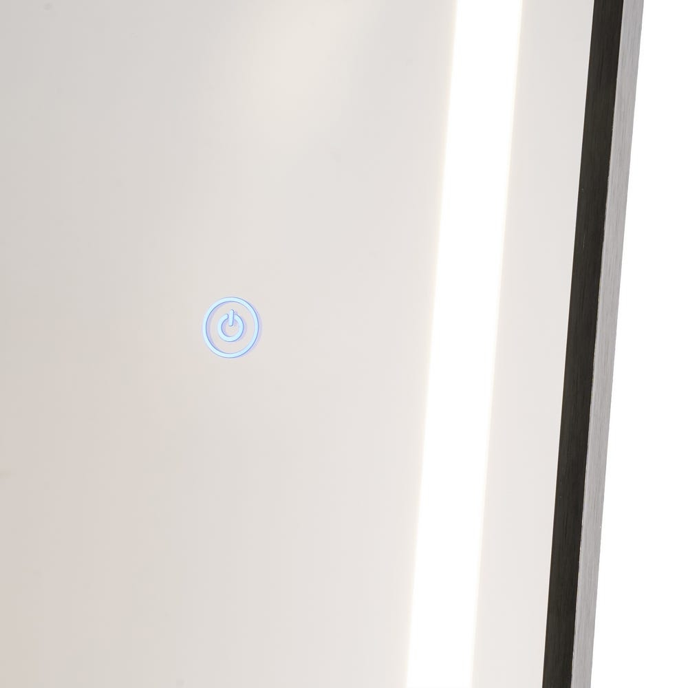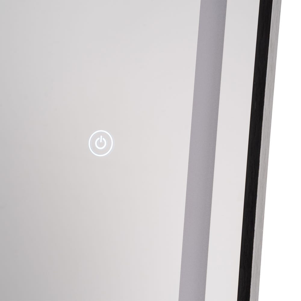 Oglindă de dressing modernă cu iluminare LED, ramă subțire din aluminiu de culoare neagră și funcție de control tactil on/off.