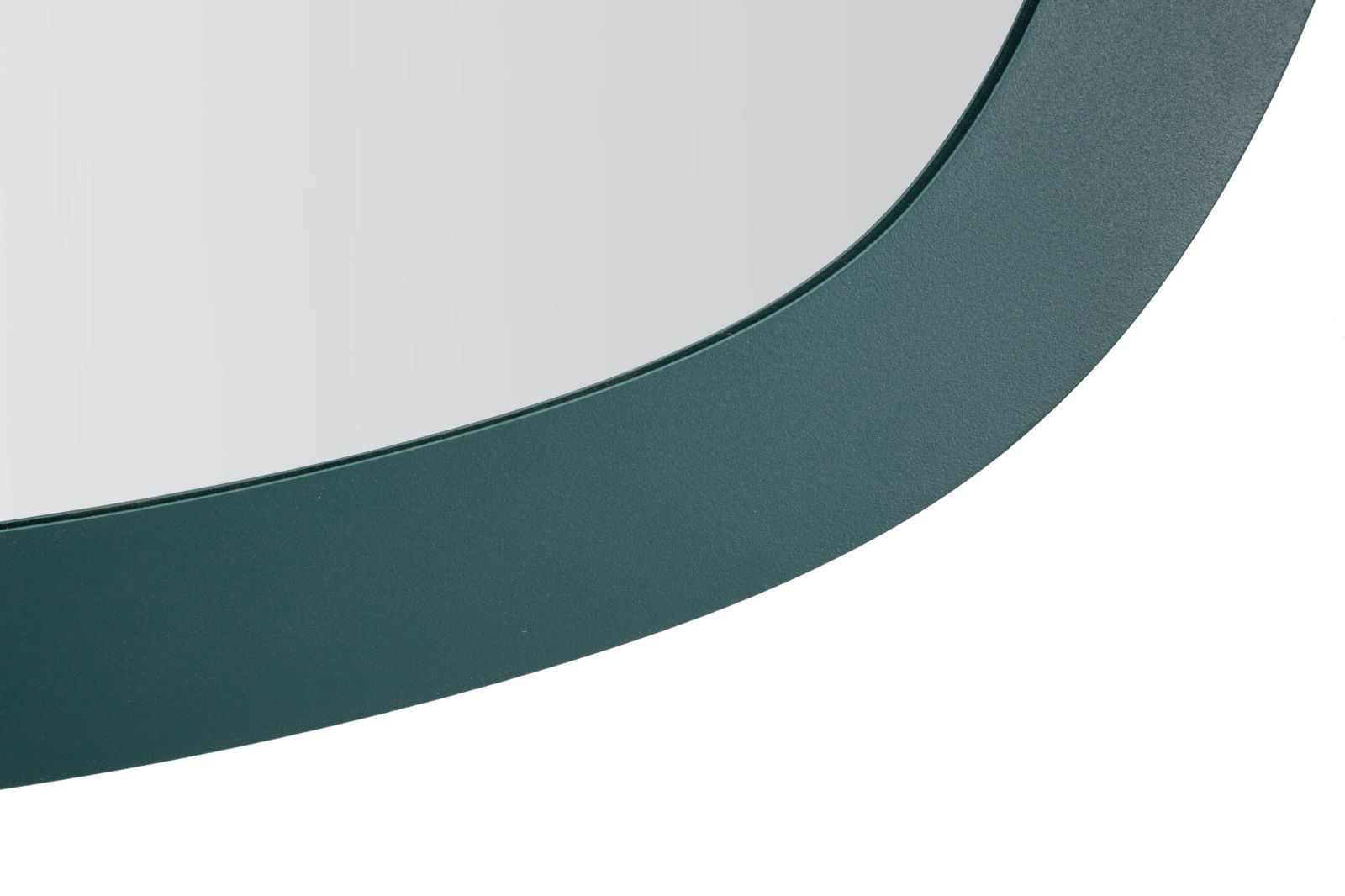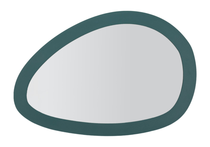 Rama lată urmărește un contur sinuos care încadrează elegant suprafața reflectorizantă, creând un contrast echilibrat între finisajul colorat și luciul oglinzii. Nuanța albastru verzui aduce profunzime și individualitate, oferind încăperii o notă distinctă, potrivită pentru spații contemporane cu identitate clară.