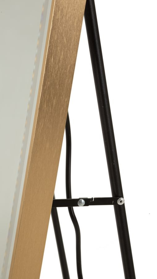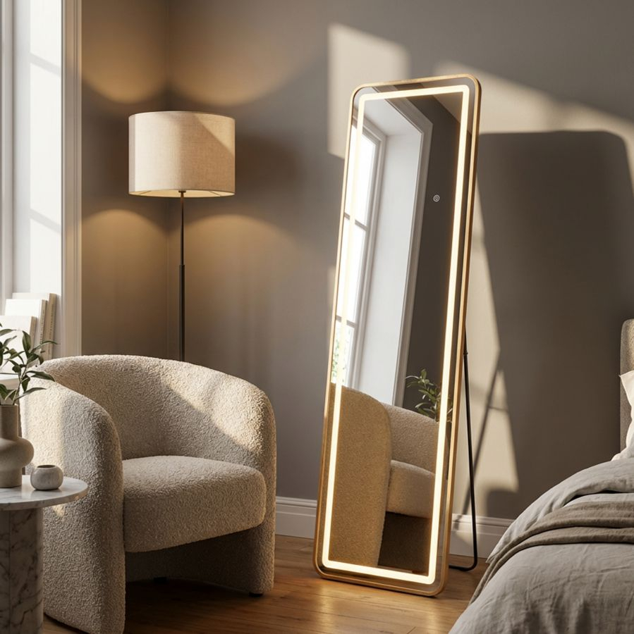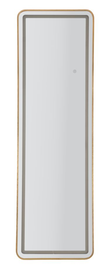 Această oglindă de podea cu iluminare LED și formă dreptunghiulară aduce un echilibru vizual clar în amenajările moderne. Rama aurie din aluminiu conturează elegant suprafața reflectorizantă, iar profilul luminos integrat evidențiază puritatea liniilor, contribuind la crearea unui spațiu aerisit și sofisticat.