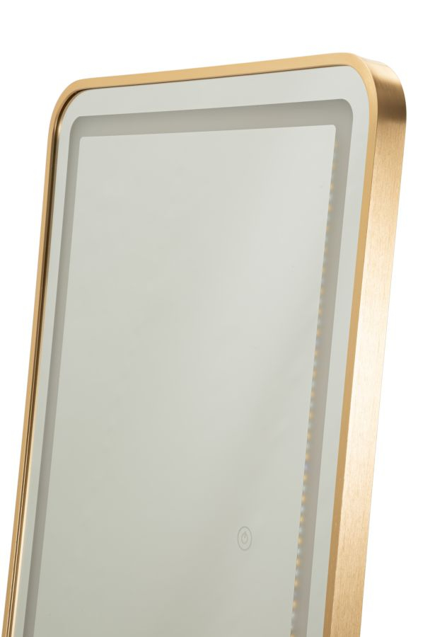 Forma dreptunghiulară cu colțuri ușor rotunjite oferă un aspect contemporan și echilibrat, iar finisajul auriu adaugă căldură și rafinament. Lumina integrată subliniază conturul oglinzii și amplifică senzația de profunzime, evidențiind silueta în mod uniform.