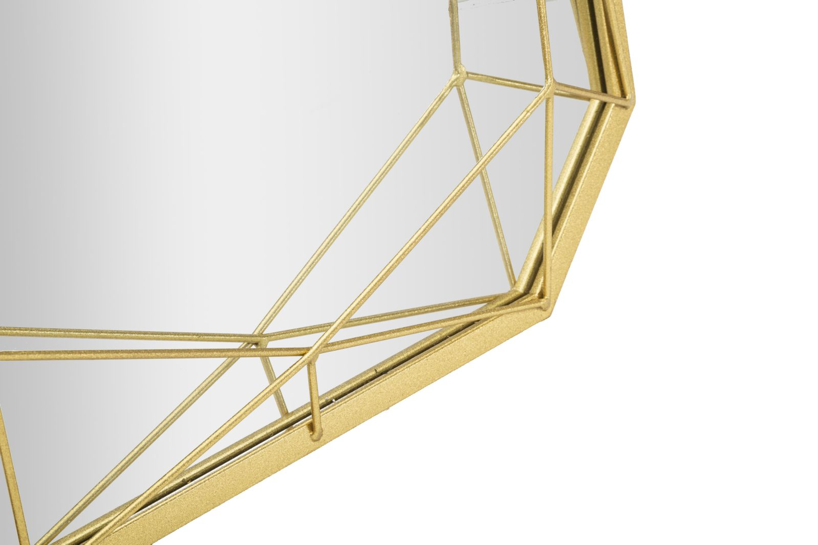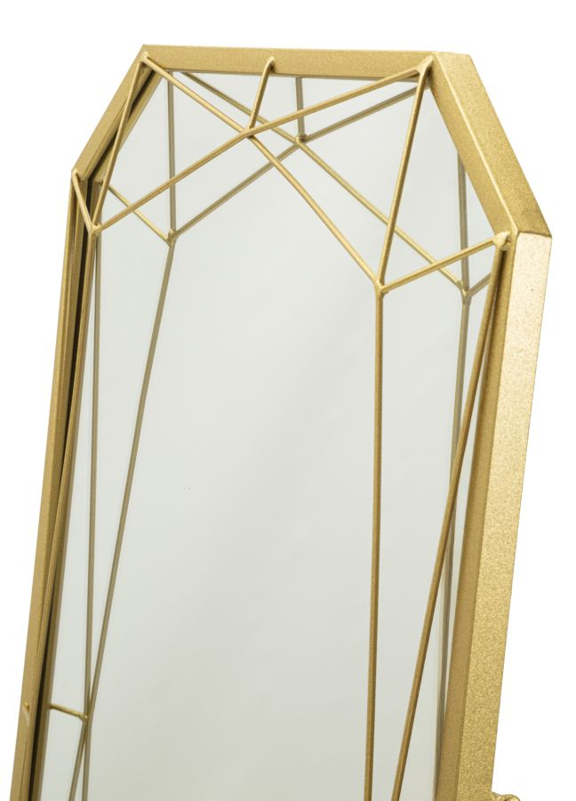 Rama metalică aurie este realizată din linii fine dispuse geometric, creând un efect vizual decorativ ce încadrează silueta oglinzii cu eleganță și căldură. Finisajul auriu reflectă subtil lumina, adăugând profunzime și un plus de strălucire încăperii.