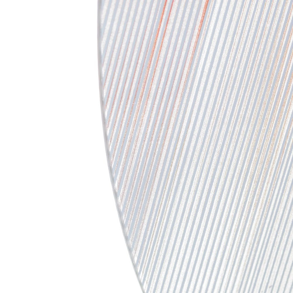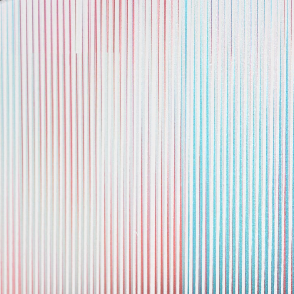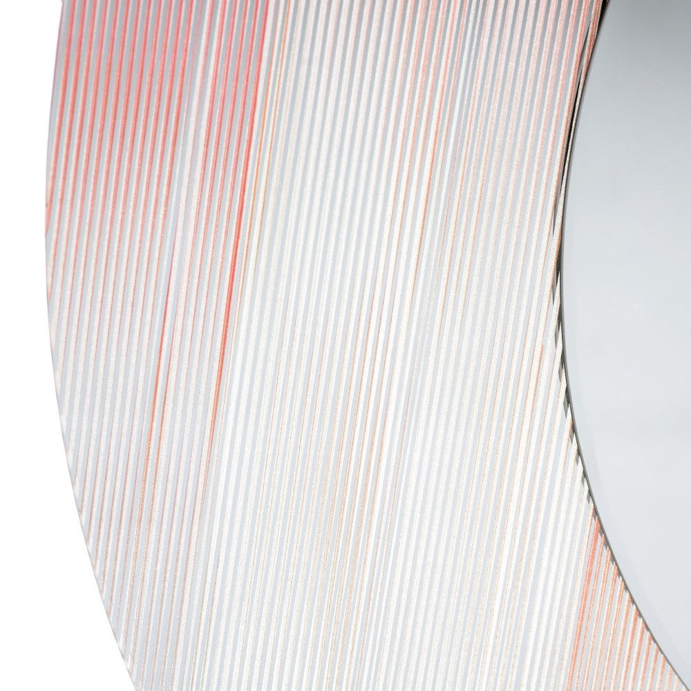 Rama din sticlă cu accente subtile de roșu și albastru creează un efect vizual artistic, aproape pictural, care se transformă în funcție de lumină. Contrastul dintre suprafața clară a oglinzii și textura decorativă a ramei oferă profunzime și un aer contemporan.