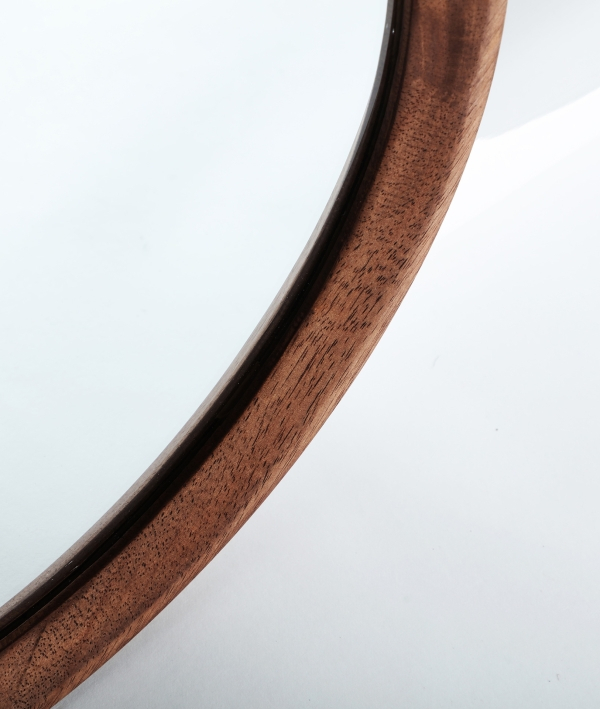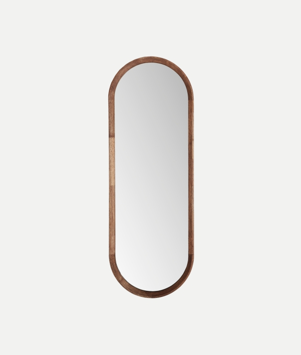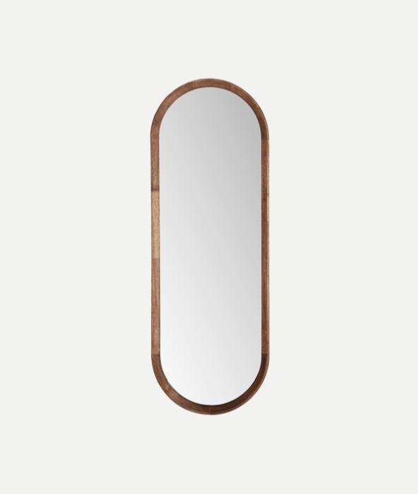 Rama este realizata din lemn de cauciuc in finisaj maro, completata de MDF, oferind stabilitate si un aspect unitar. Forma ovala cu capete rotunjite accentueaza verticalitatea oglinzii si adauga un plus de fluiditate vizuala, pastrand totodata o expresie clara si bine definita.