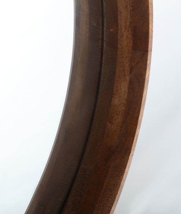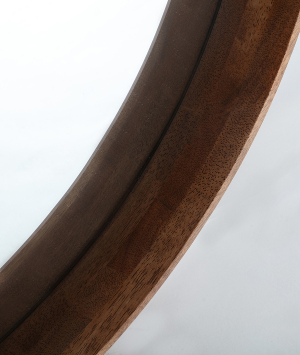 Rama este realizata din lemn de cauciuc in finisaj maro, combinata cu MDF in aceeasi nuanta, oferind un aspect unitar si cald. Suprafata oglinzii este incadrata discret, permitand materialului natural sa fie elementul vizual dominant.