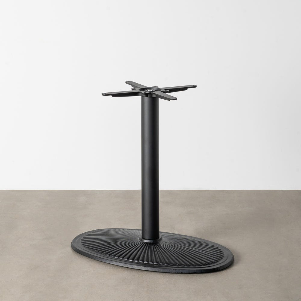 Picior de masă profesional pentru mese de restaurant, cafenea și HoReCa, realizat din fontă neagră rezistentă. Modelul are o coloană cilindrică solidă și o bază ovală decorată, care oferă stabilitate și un plus de rafinament vizual.