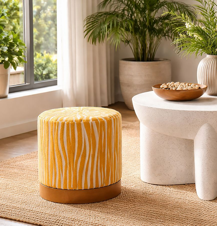 Acest puf rotund cu imprimeu zebra aduce un accent decorativ inspirat din natură în amenajările moderne. Contrastul dintre modelul mustar și baza maro creează un efect vizual expresiv, transformând piesa într-un element de impact potrivit pentru living, dormitor sau spații de relaxare cu personalitate.