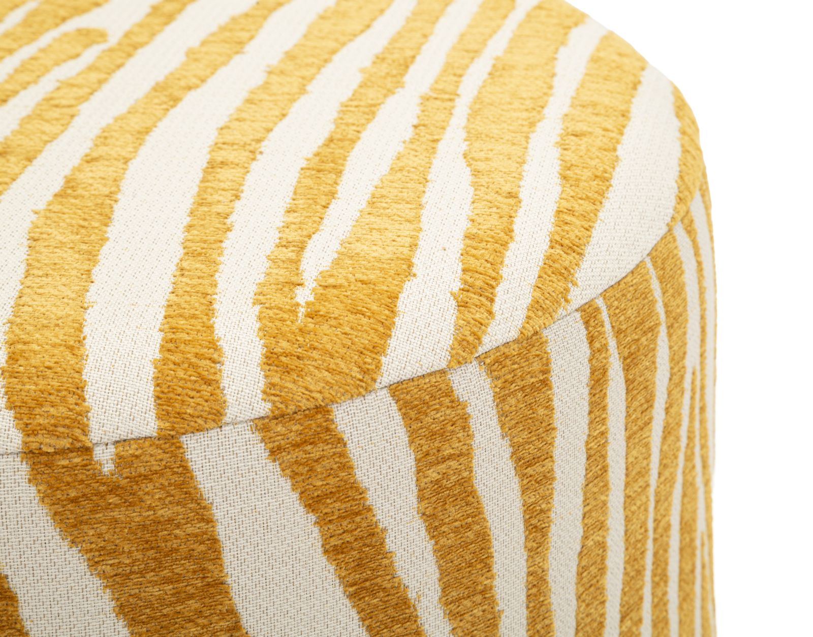 Imprimeul zebra acoperă uniform suprafața tapițată, evidențiind textura stofei și dinamismul liniilor contrastante. Forma cilindrică și proporțiile compacte îl fac ușor de integrat ca loc suplimentar de ședere sau ca accent decorativ într-un decor contemporan.