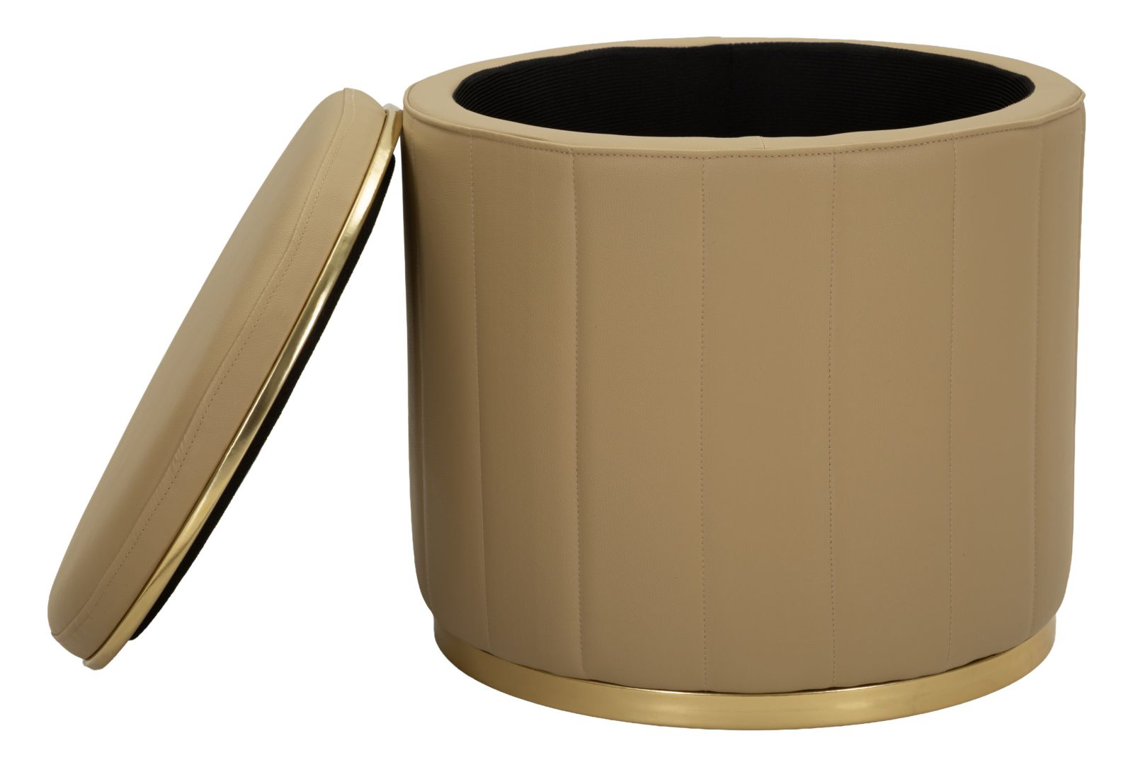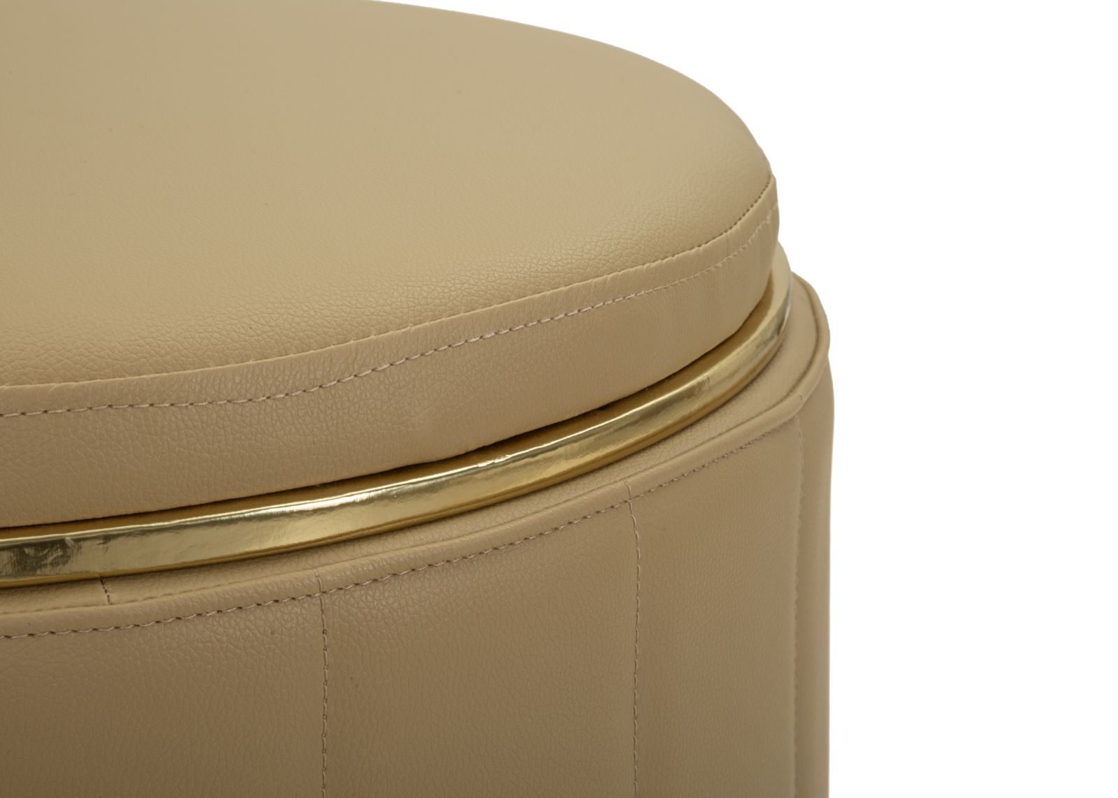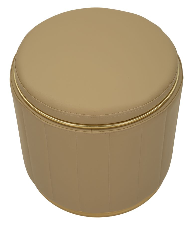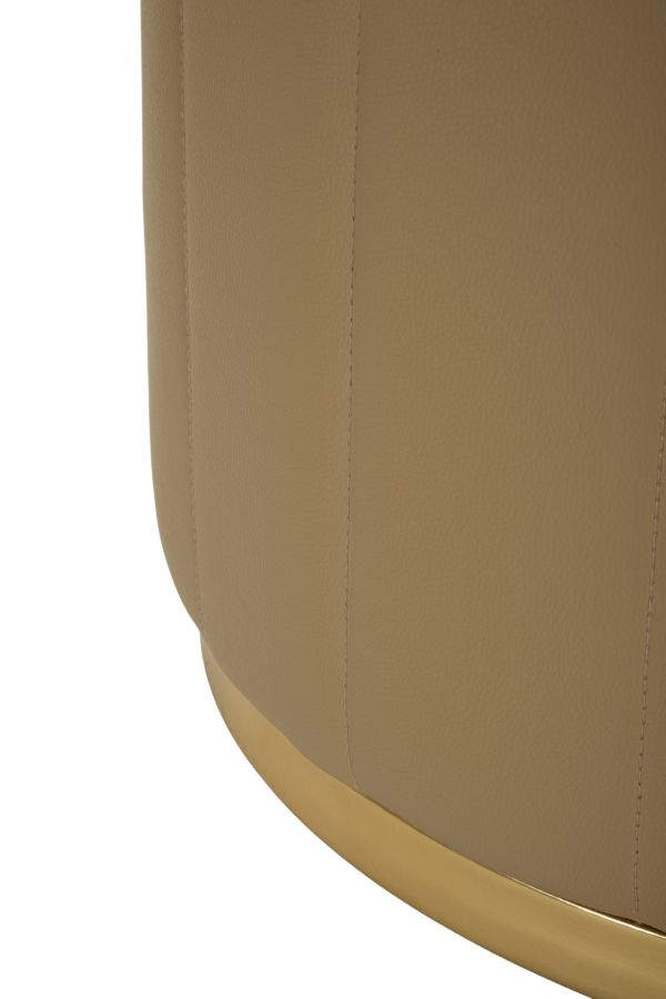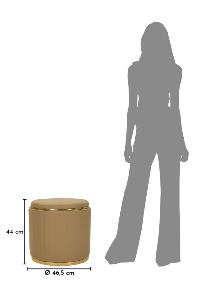 Liniile verticale ale tapițeriei oferă un aspect elegant și ordonat, în timp ce baza metalică aurie adaugă un accent sofisticat care captează discret lumina. Forma rotundă și proporțiile echilibrate fac din acest puf un element decorativ versatil, ușor de integrat în living, dormitor sau dressing.