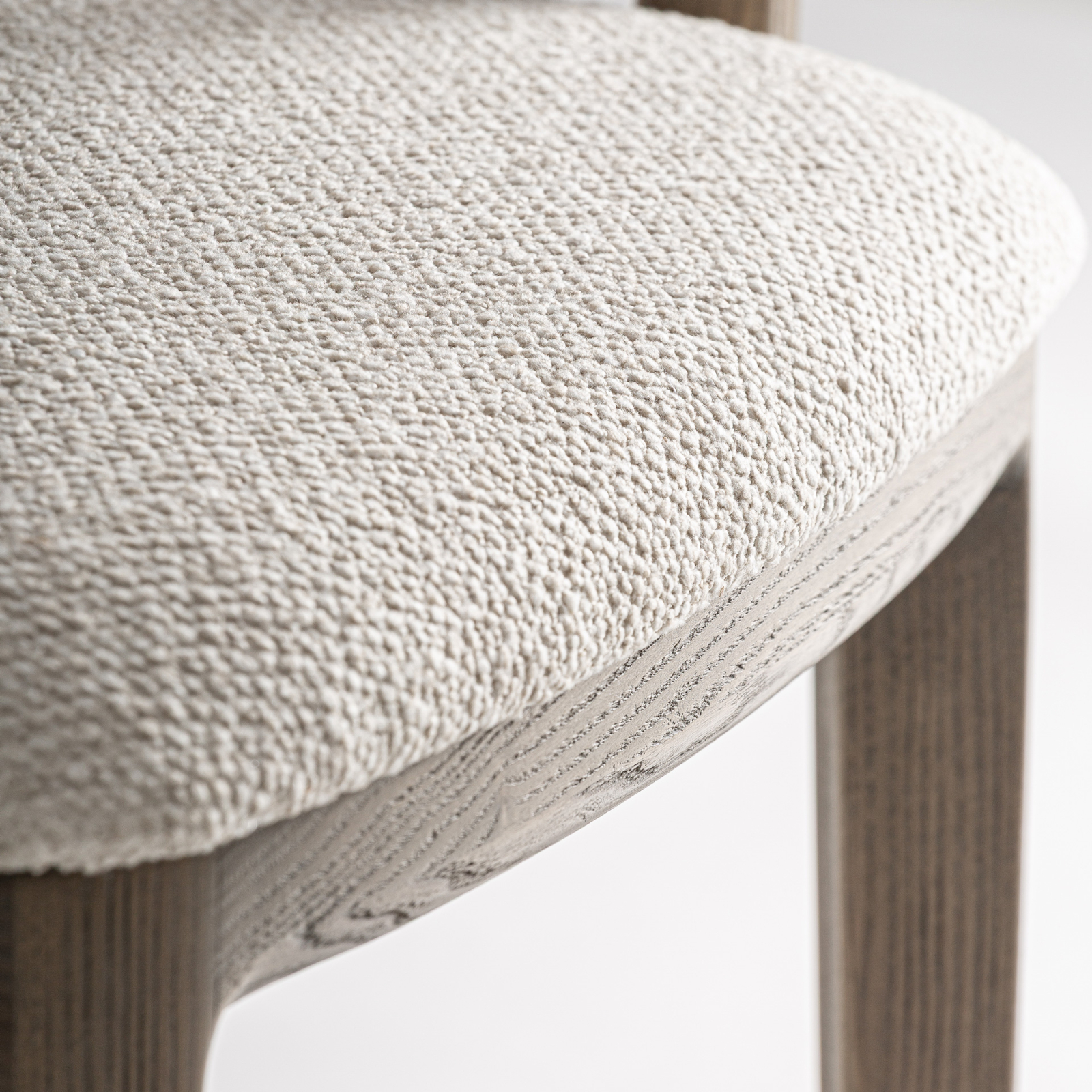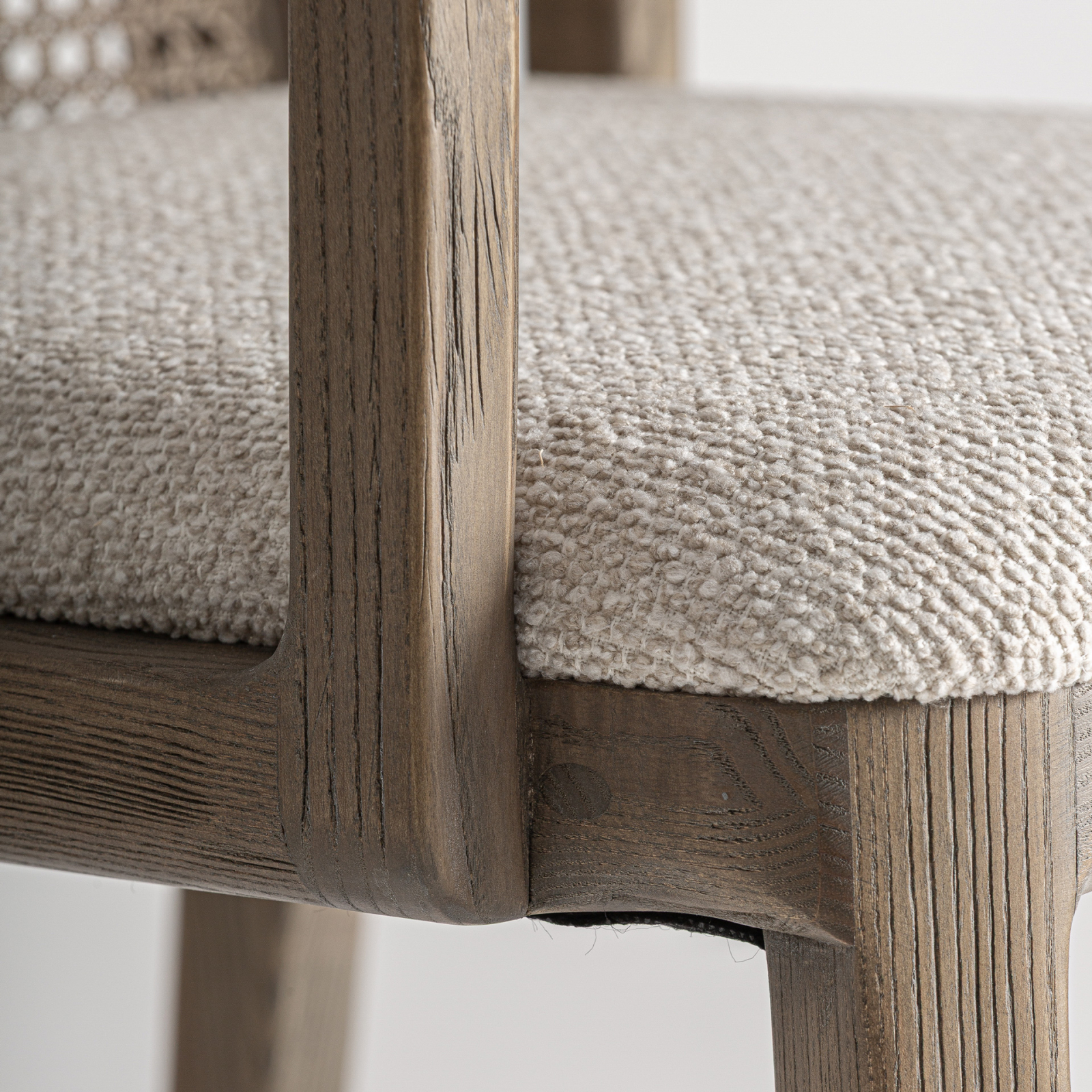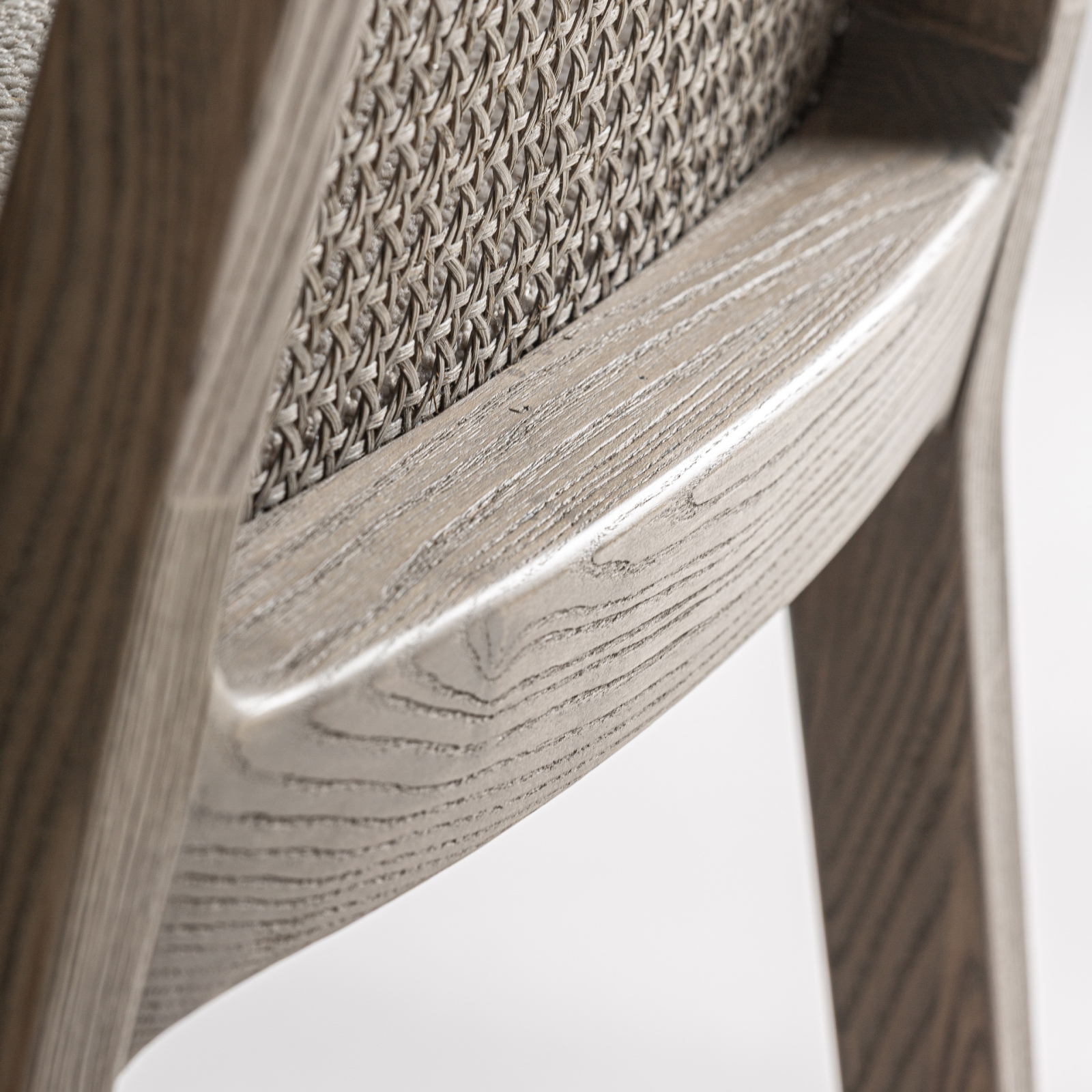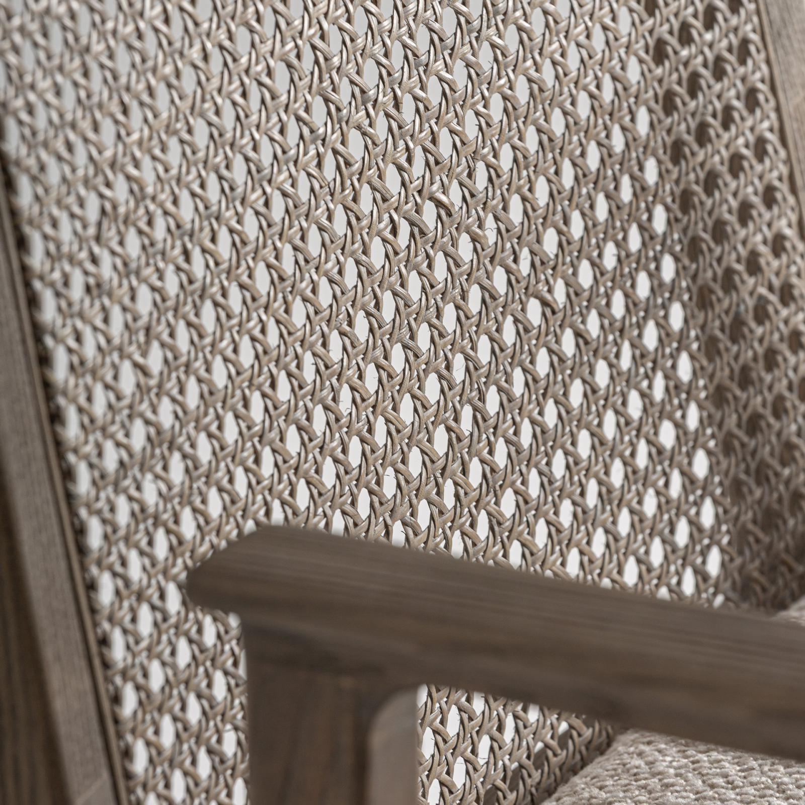 Spătarul cu element împletit devine punctul vizual principal și pune în valoare structura din lemn de frasin. Brațele sunt integrate într un cadru clar definit iar liniile drepte contribuie la o formă echilibrată. Șezutul tapițat în in bej completează aspectul natural și oferă o senzație vizuală caldă.