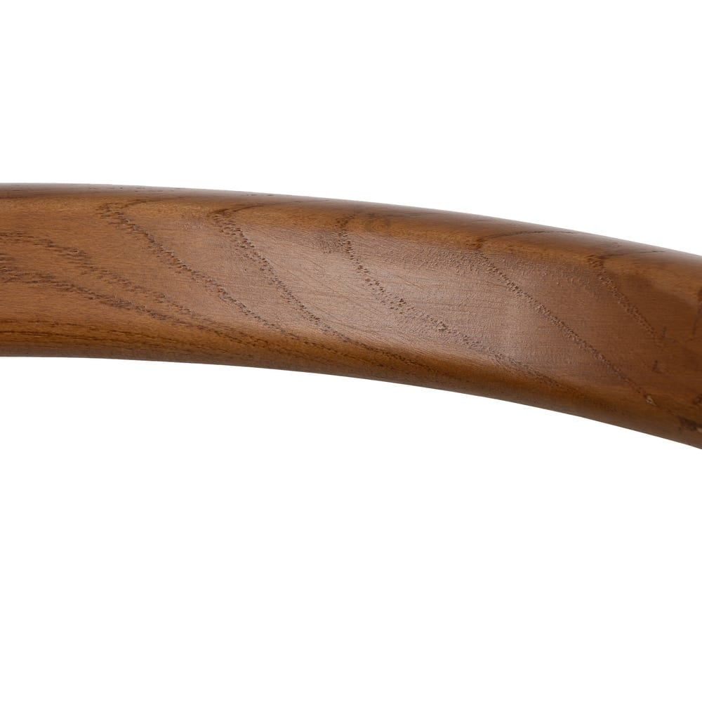 Designul îmbină o structură din lemn de ulm în nuanță maro cald, cu spătar curbat tip semicerc și brațe integrate, pentru susținere naturală și o poziție comodă la masă. Formele rotunjite ale spătarului și îmbinările vizibile oferă un aspect elegant, potrivit atât pentru interioare moderne, cât și pentru spații cu influențe scandinave sau mid-century.