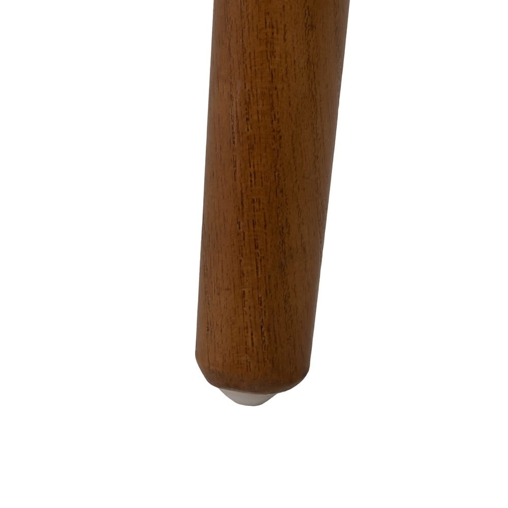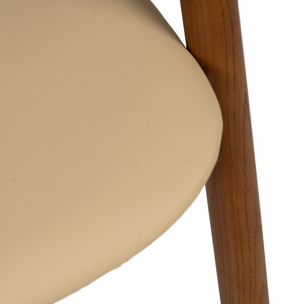 Șezutul crem este ușor conturat și are o suprafață netedă, cu aspect de stofă tip piele, completată de umplutură din spumă pentru confort. Proporțiile sunt echilibrate pentru dining și HORECA, iar picioarele din lemn, ușor evazate, contribuie la stabilitate și la un look aerisit, ideal pentru zone cu trafic și utilizare repetată.