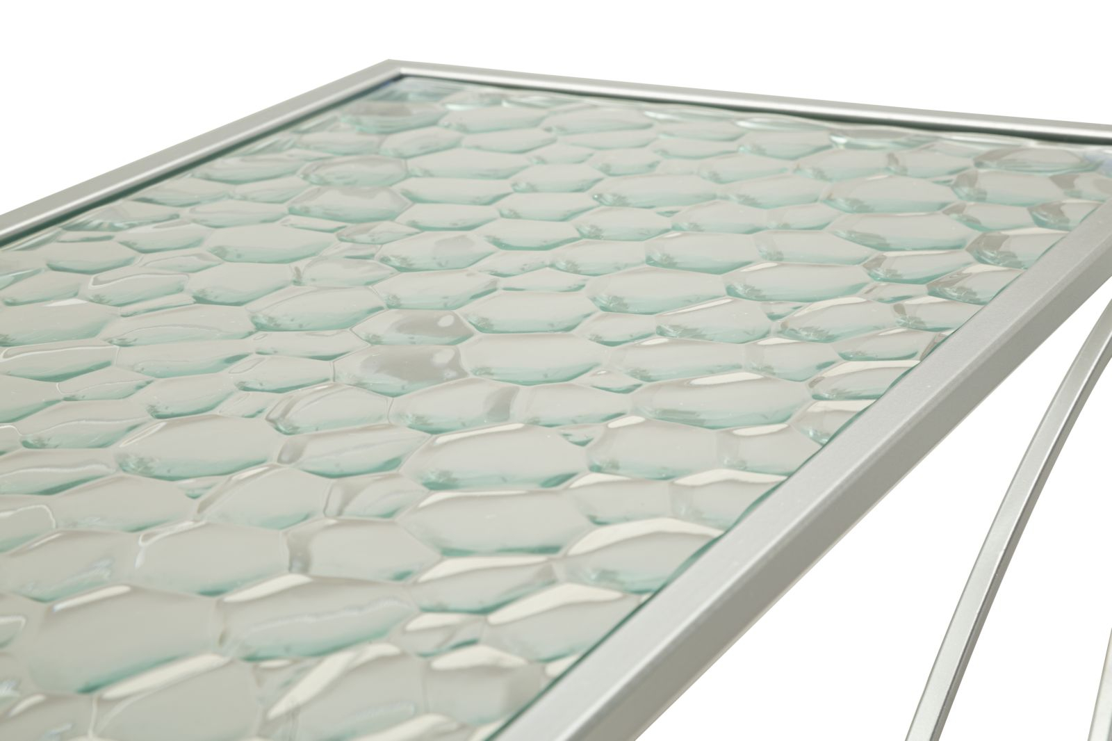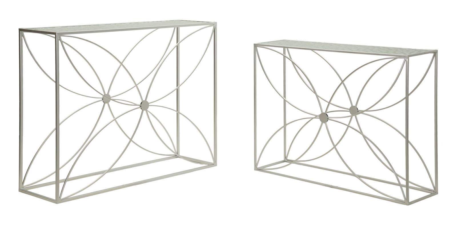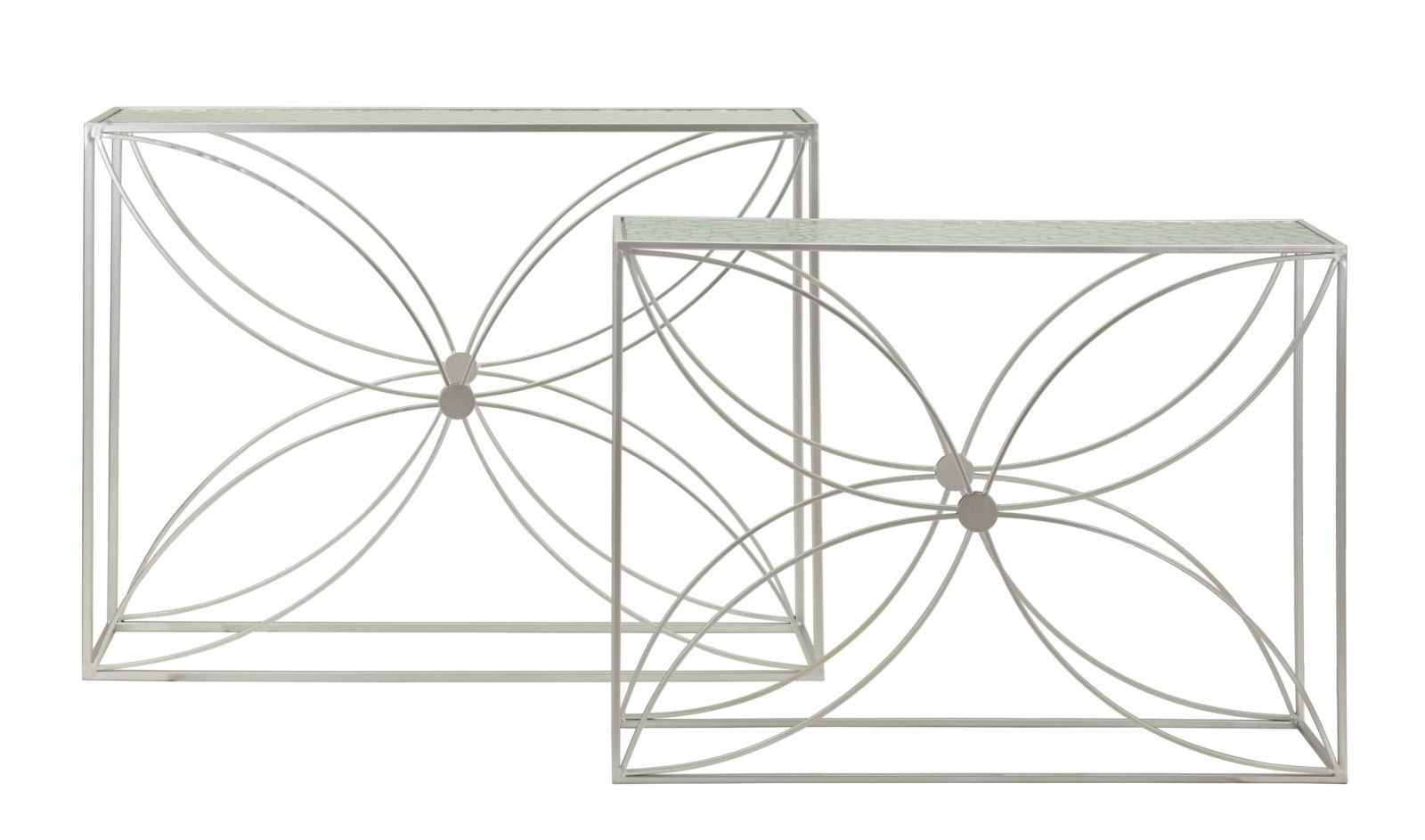 Setul de console Paradise impresionează prin eleganță și rafinament, transformând orice spațiu într-un decor sofisticat. Structura metalică argintie este completată de un model floral geometric delicat, care adaugă personalitate și lumină încăperii, în timp ce blatul din sticlă oferă un aspect aerisit și modern.