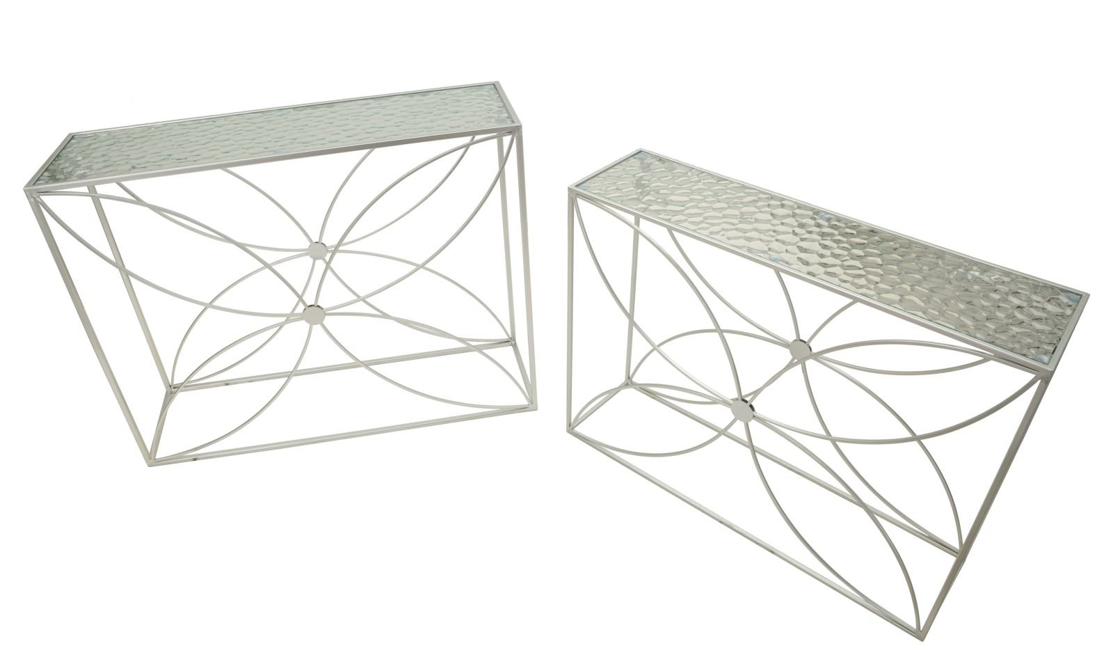Set 2 console decorative din metal argintiu și blat din sticlă cu model floral geometric pentru hol living sau spații elegante