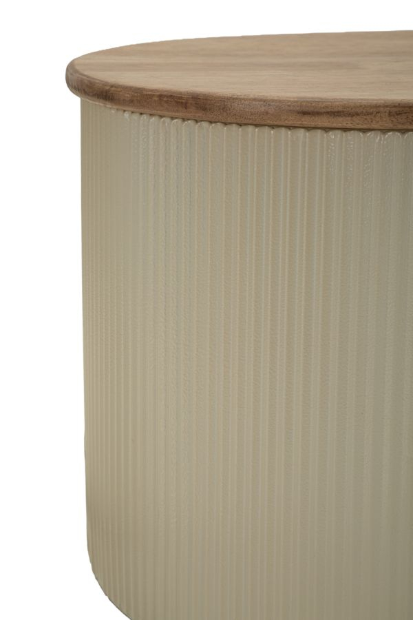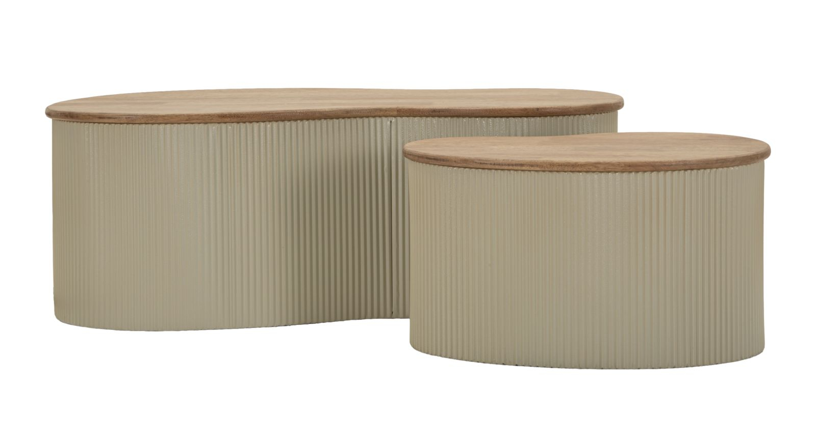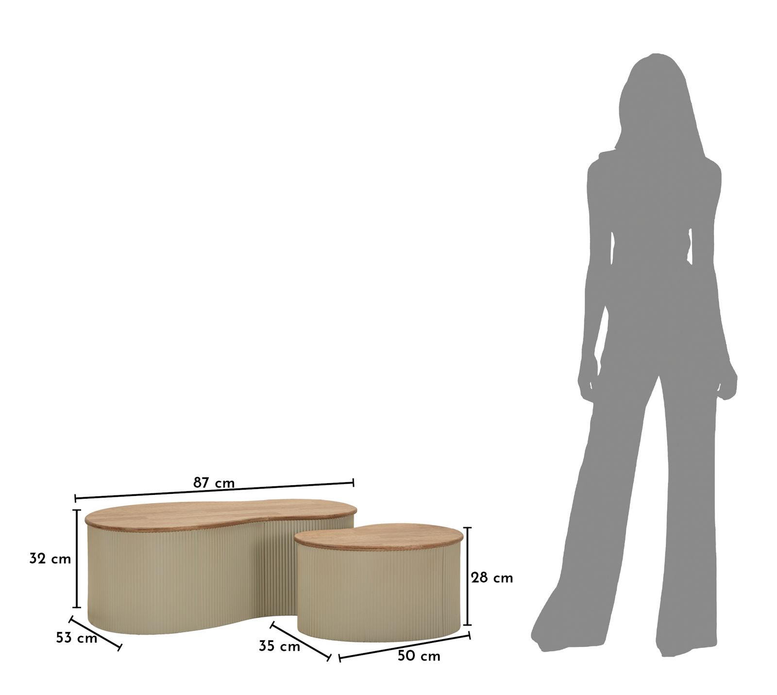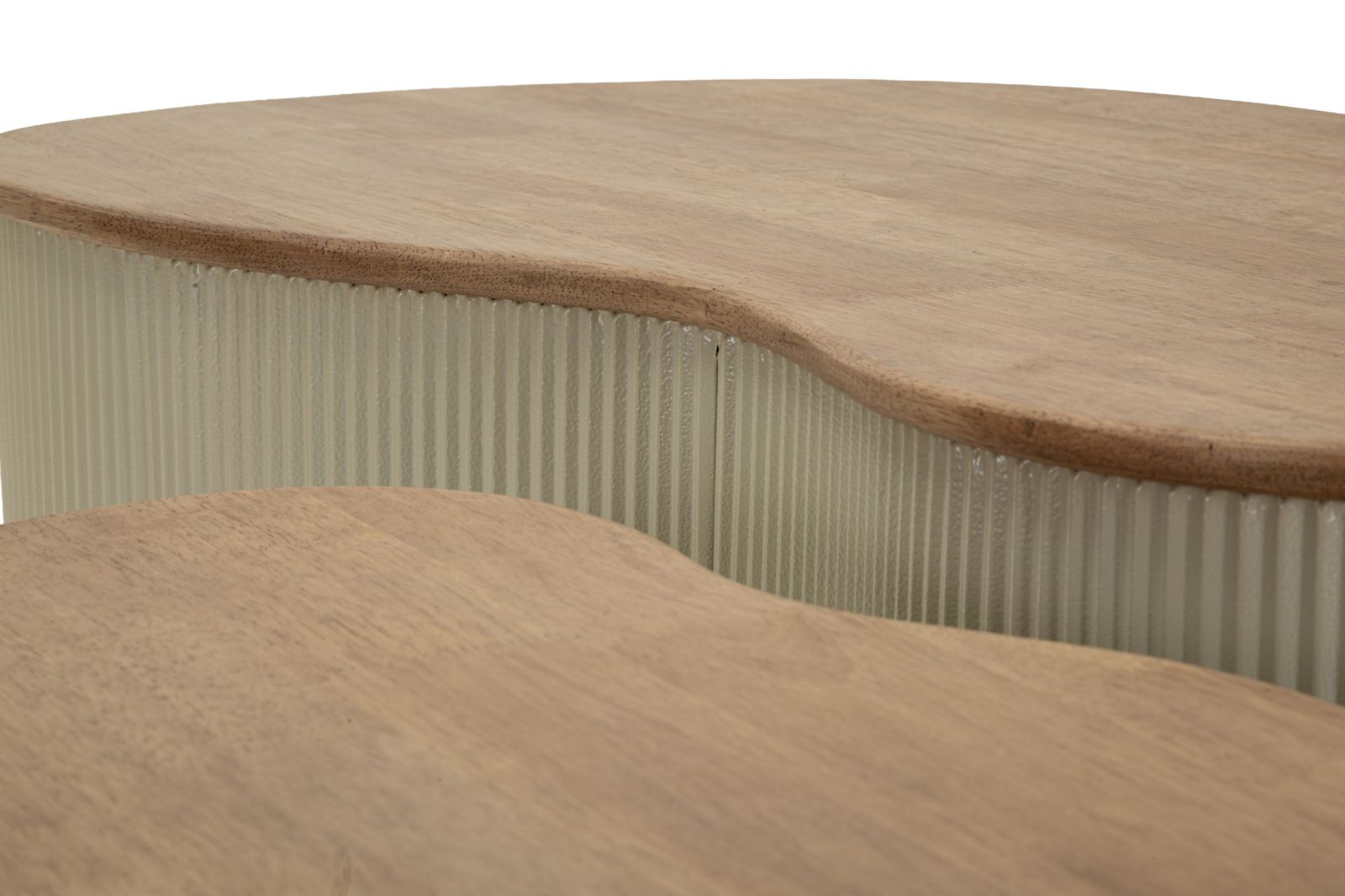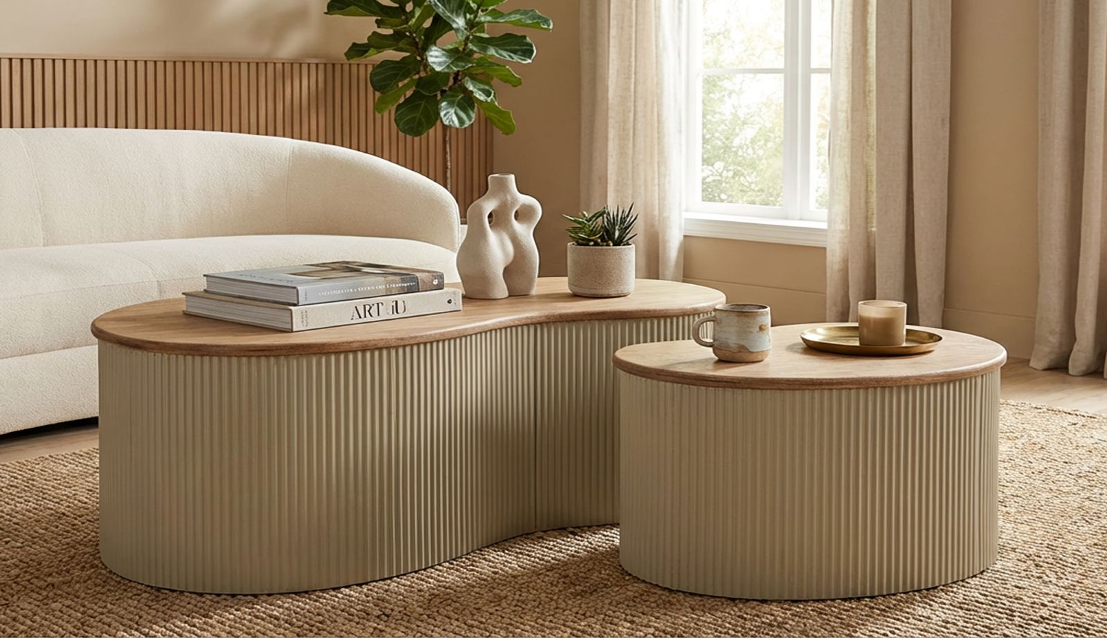 Blaturile cu aspect de lemn adaugă naturalețe și căldură compoziției, în timp ce structura albă subliniază forma rotunjită și proporțiile echilibrate. Diferența de dimensiune permite așezarea lor împreună pentru un efect suprapus sau separat, în funcție de dinamica spațiului.