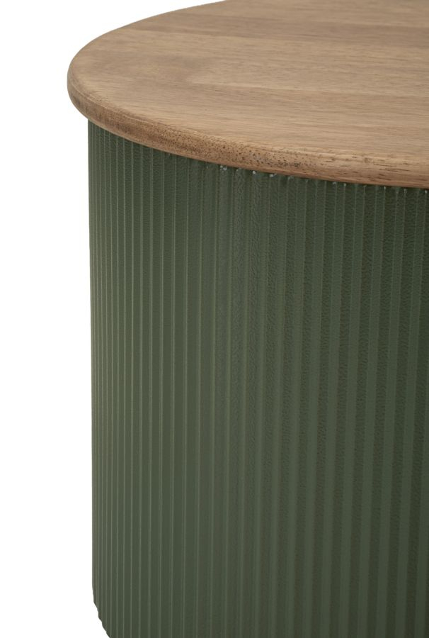 Blaturile cu finisaj aspect lemn adaugă căldură și naturalețe, în timp ce baza verde cu textură canelată evidențiază forma rotunjită și proporțiile echilibrate. Diferența de dimensiune permite poziționarea lor împreună pentru un efect dinamic sau separat, în funcție de nevoile spațiului.