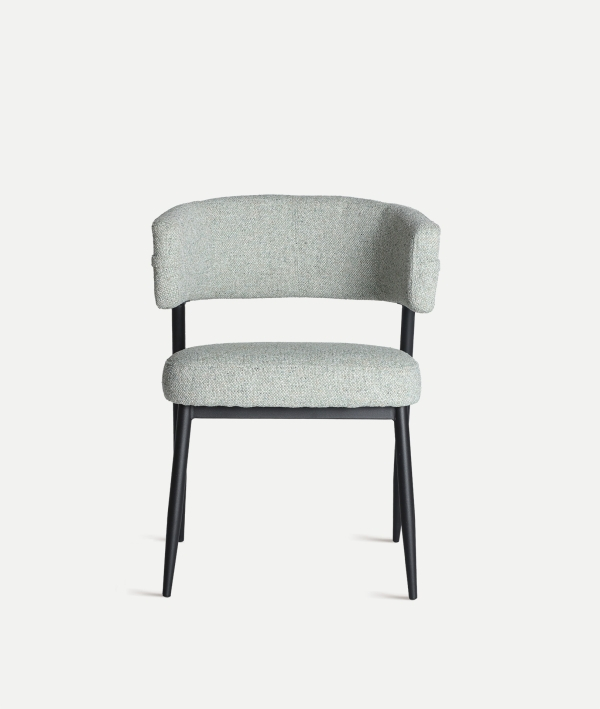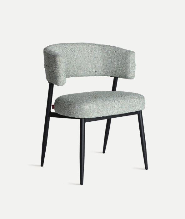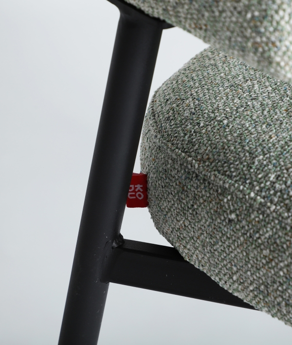 Structura este realizata din fier cu finisaj negru mat, oferind stabilitate si durabilitate pentru utilizare zilnica. Sezutul si spatarul sunt tapitate cu stofa din poliester verde, cu finisaj marmorat, asigurand un echilibru intre confort si rezistenta vizuala, adaptat spatiilor de dining, birourilor sau zonelor de tip lounge.