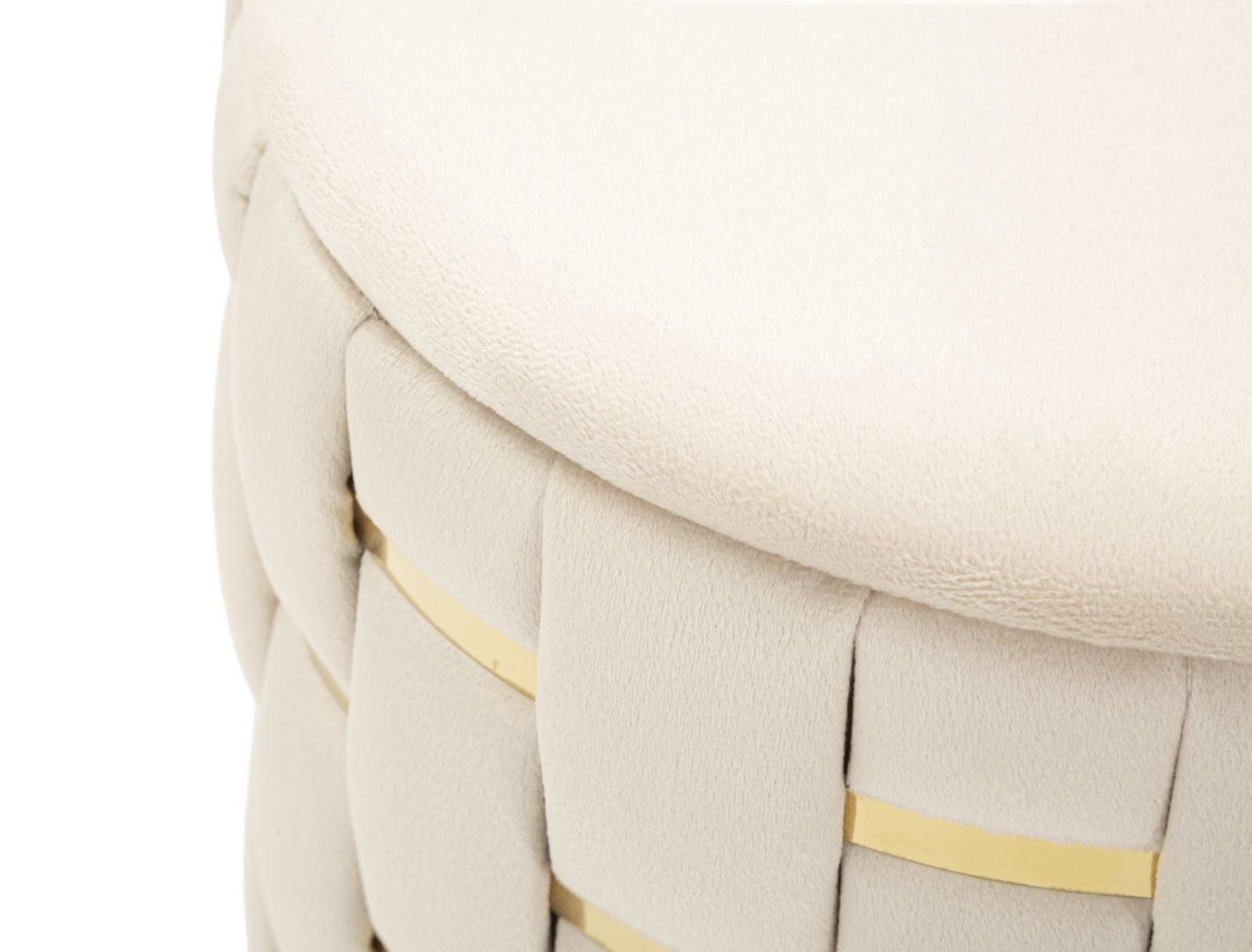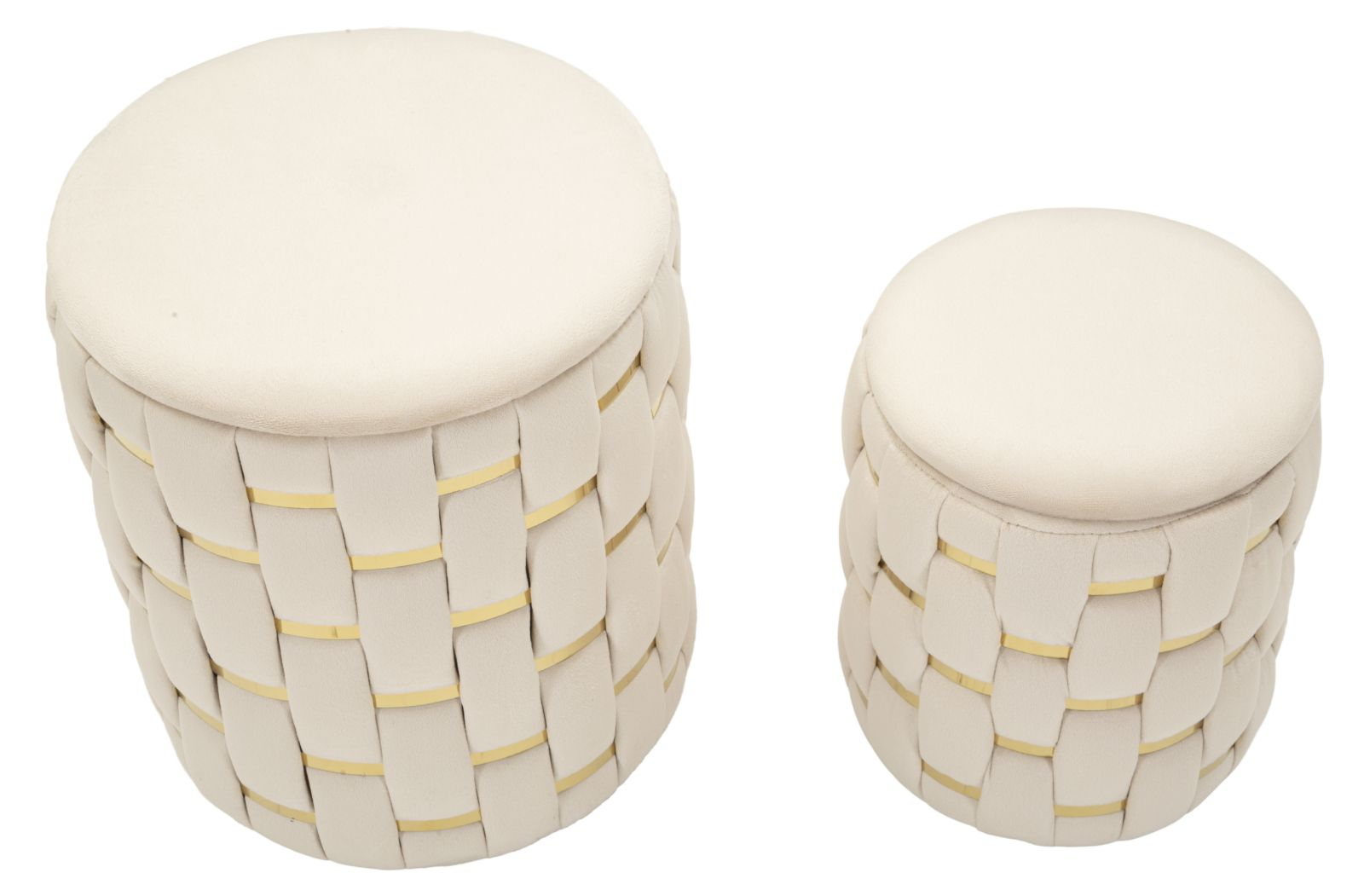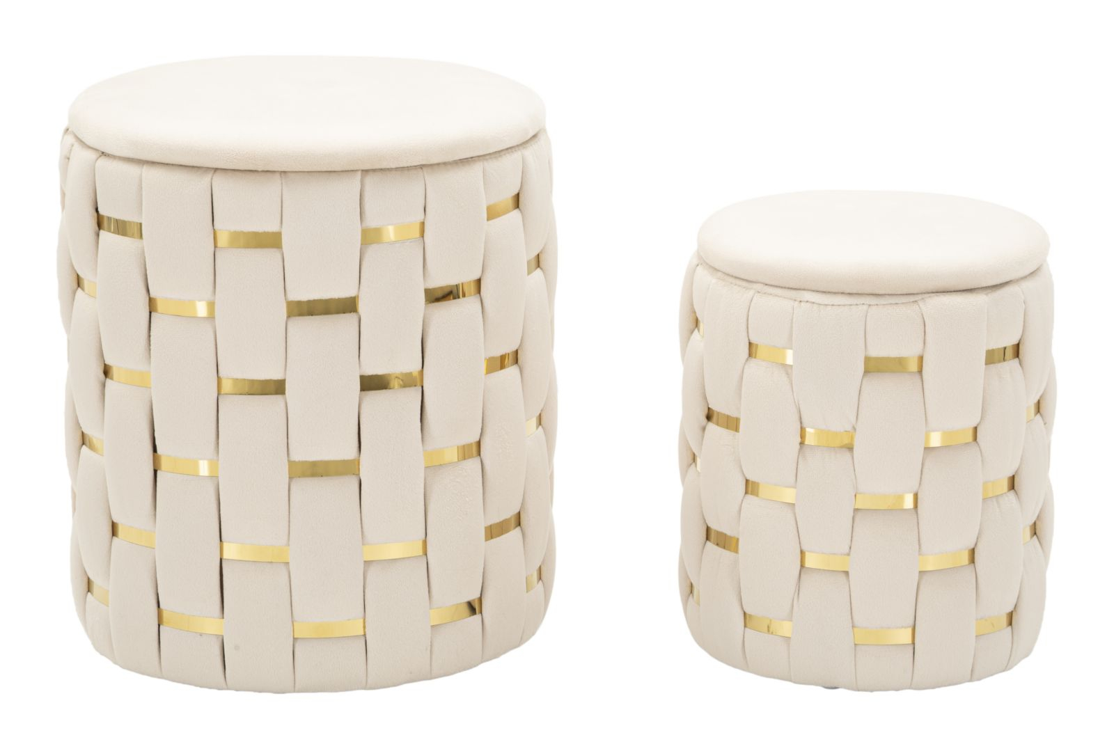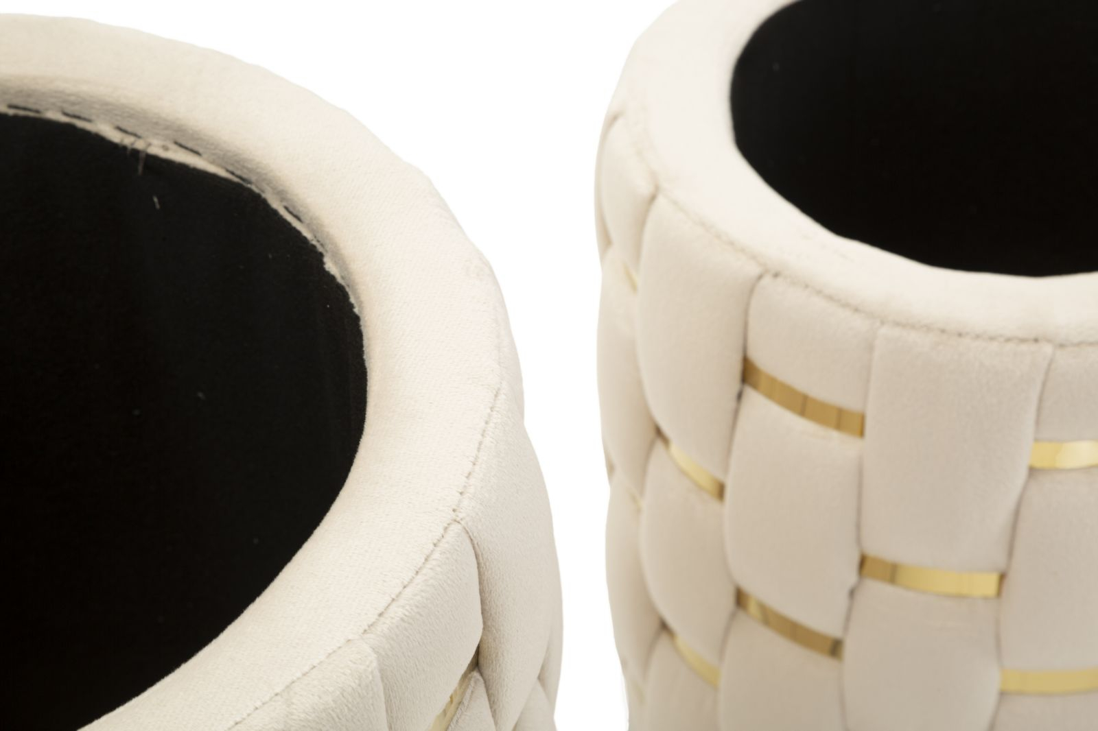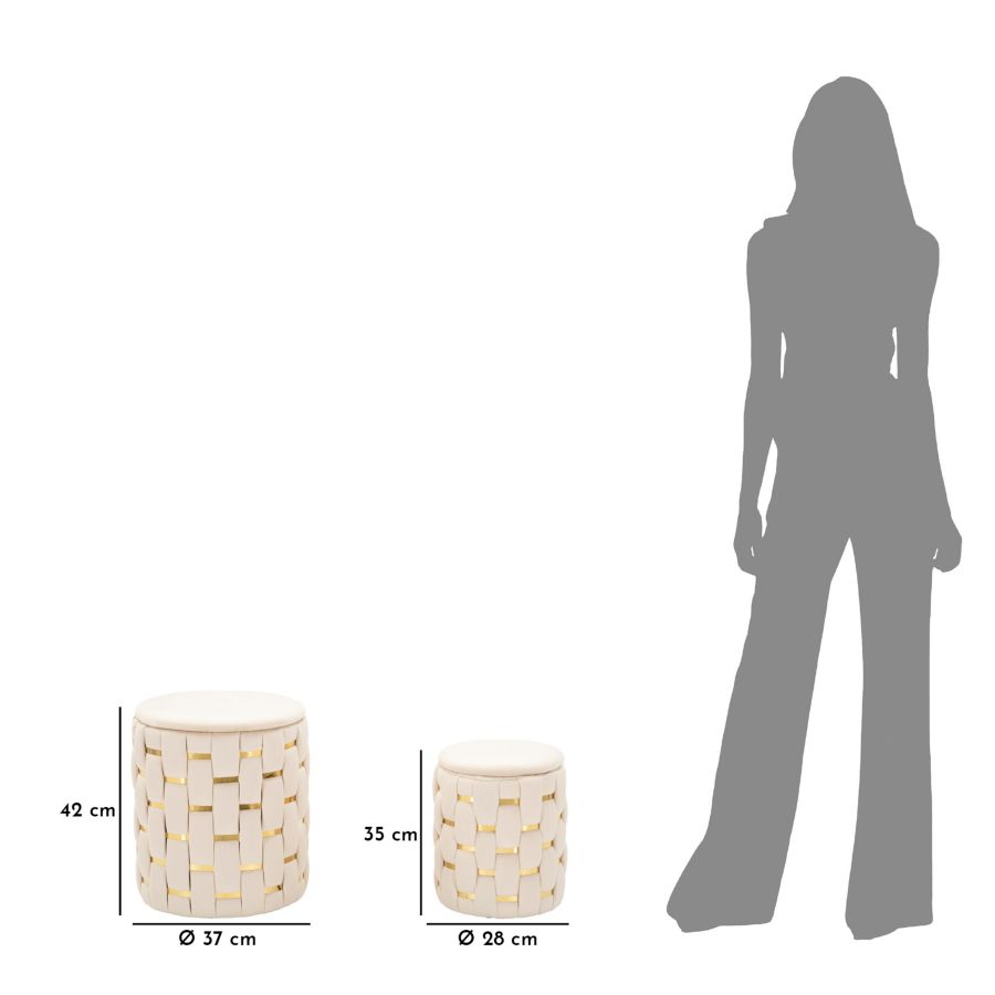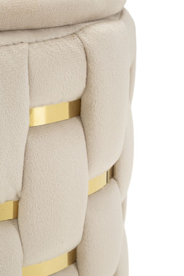 Setul de 2 taburete Shanty impresionează prin designul modern și elegant, cu un finisaj crem atemporal și inserții aurii ce adaugă un plus de rafinament. Tapițeria cu efect de împletitură oferă un aspect sofisticat și distinctiv, făcându-le potrivite pentru living, dormitor sau hol.