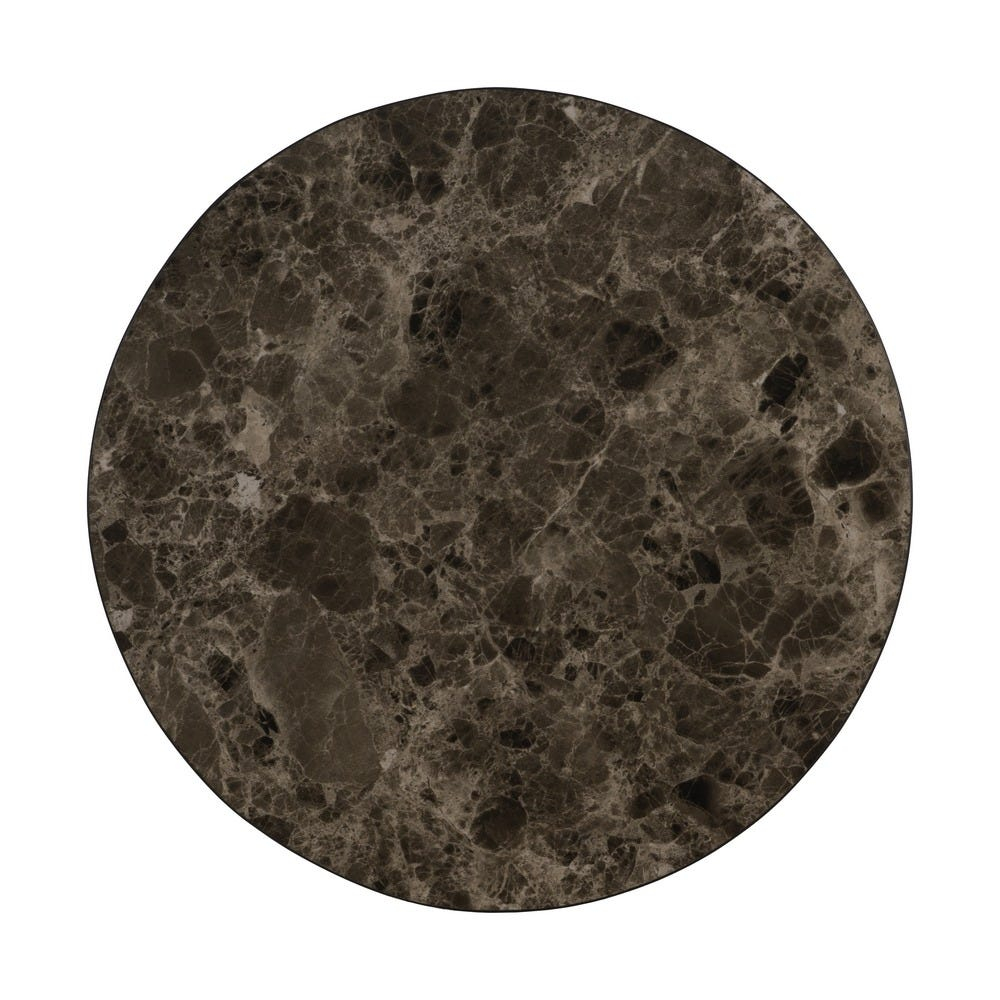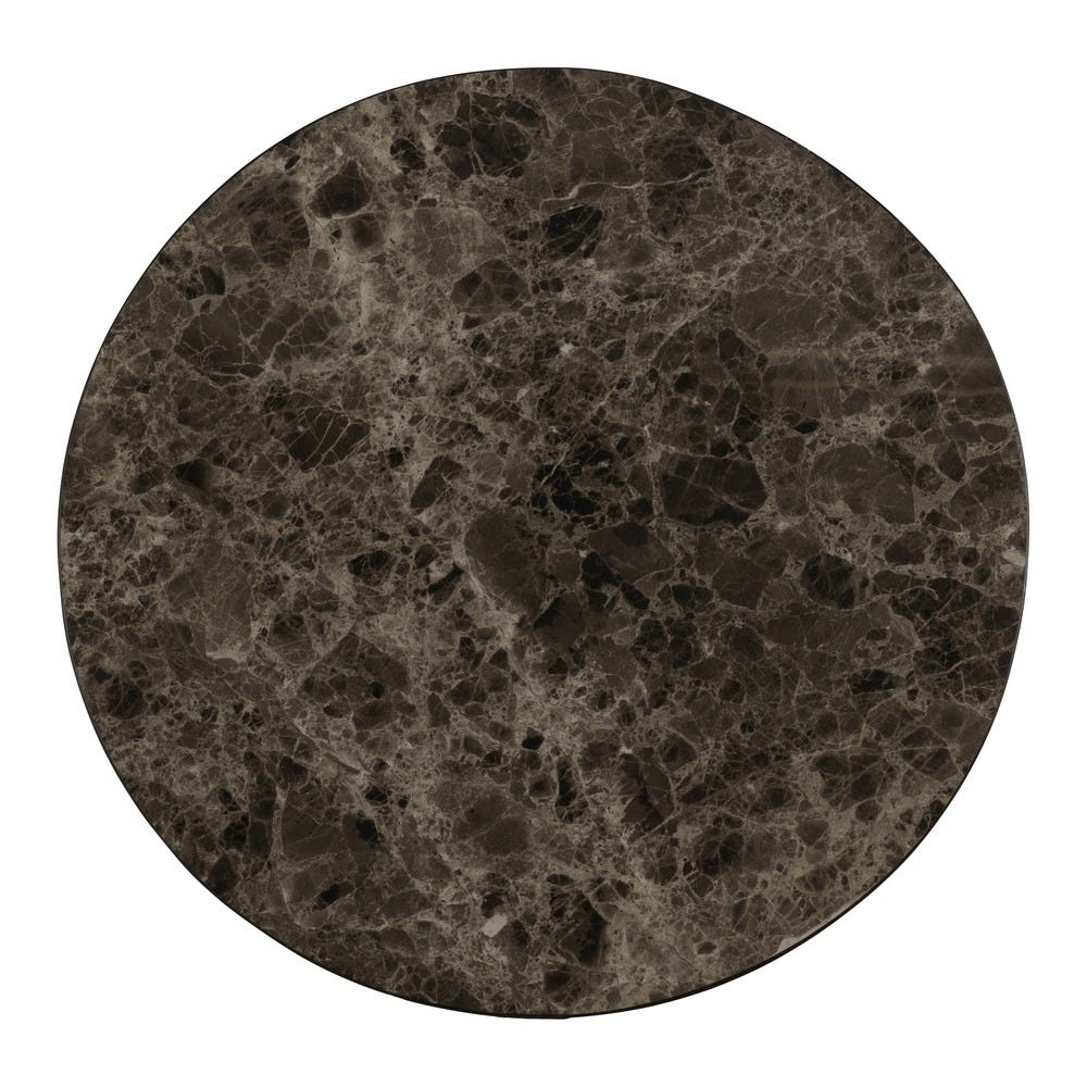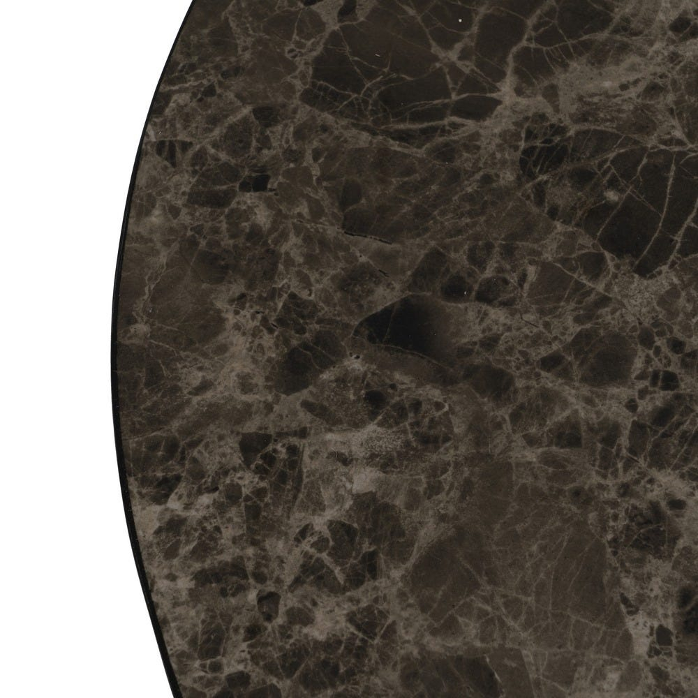 Blaturile rotunde din ceramică lucioasă imită marmura într-o nuanță elegantă de maro închis, cu venaturi naturale care oferă profunzime și o textură vizuală sofisticată. Baza din lemn de acacia adaugă căldură compoziției și susține piesa cu un volum solid, dar curat, fără exces decorativ.