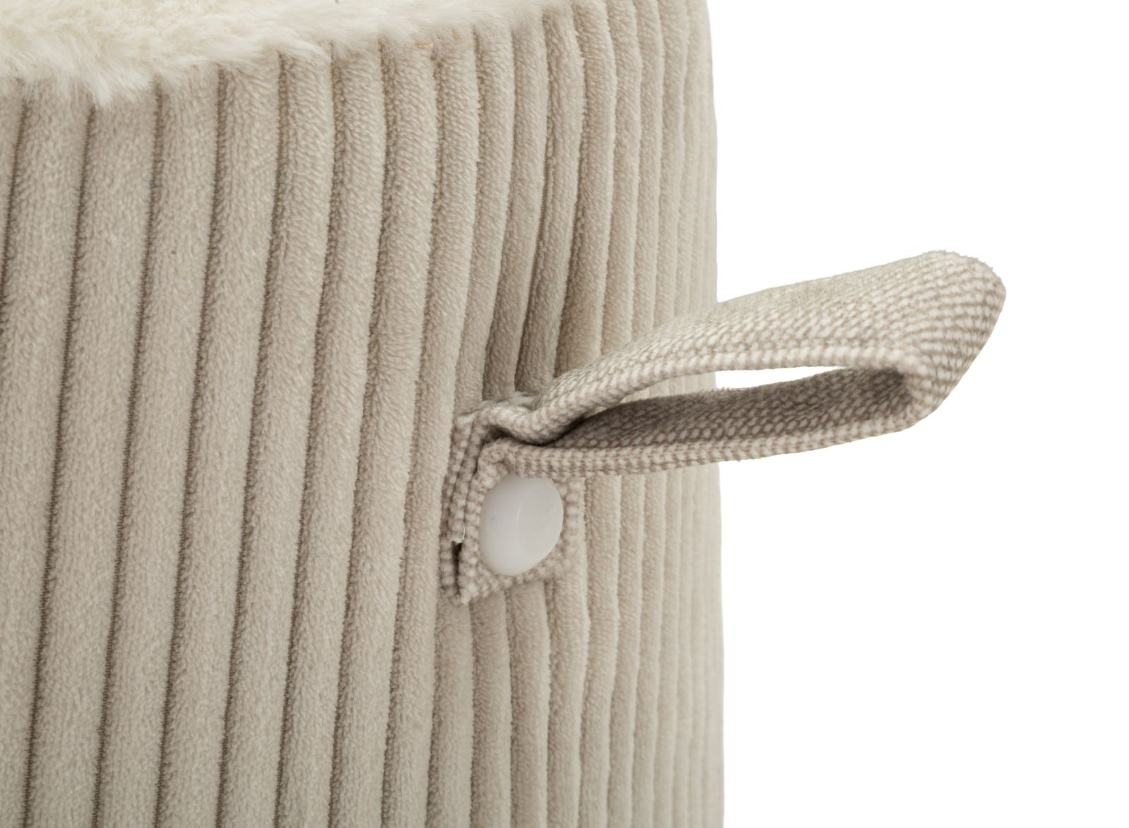 Mânerul textil discret adaugă un detaliu practic și permite mutarea ușoară a taburetului, făcându-l ideal pentru spații dinamice și confortabile. Designul său echilibrează funcționalitatea cu eleganța discretă.