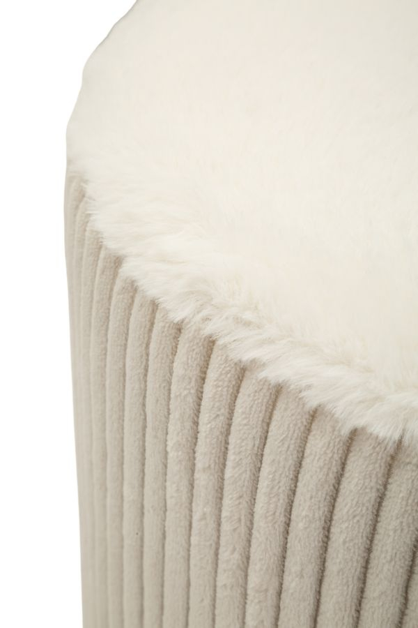 Taburetul rotund conic tapițat alb cu textură plisată adaugă un plus de stil și funcționalitate în amenajarea interioară. Forma conică și textura verticală creează un efect vizual elegant și modern. Piesa poate fi utilizată ca loc suplimentar de ședere sau suport pentru picioare în living sau dormitor.
